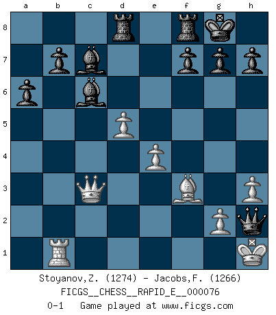 Last move : 0-1 2012 March 4 20:8:20 [Event "FICGS__CHESS__RAPID_E__000076"] [Site "FICGS"] [Date "2012.02.23"] [Round "1"] [White "Stoyanov,Zdravko"] [Black "Jacobs,Francois"] [Result "0-1"] [WhiteElo "1274"] [BlackElo "1266"] 1.e4 c5 2.Nf3 e6 3.h3 a6 4.a3 Nc6 5.d3 d6 6.Be2 Nf6 7.Bg5 Be7 8.Bxf6 Bxf6 9.c3 O-O 10.O-O Bd7 11.Nbd2 Rc8 12.Re1 Qb6 13.Rb1 Qc7 14.b4 Bxc3 15.Rc1 cxb4 16.axb4 Bxb4 17.Nd4 Bc5 18.N2f3 Qb6 19.Rb1 Qa7 20.Nxc6 Bxf2+ 21.Kh1 Bxc6 22.Rf1 Bb6 23.Nd2 e5 24.Nc4 Bc7 25.Bg4 Rcd8 26.Na5 Bxa5 27.Rf2 Qxf2 28.Bf3 Qg3 29.Qb3 Bc7 30.Qc3 d5 31.exd5 e4 32.dxe4 Qh2+ 0-1 Sicilian defense Kingside Castling by player Black (move 9) Kingside Castling by player White (move 10) Player Black won this chess game. Follow this game move after move (download)The Chess pieces are the block alphabet which shapes thoughts; and these thoughts, although making a visual design on the chessboard, express their beauty abstractly, like a poem. (Marcel Duchamp) Karpov ist ein Museumsstück. (Garry Kasparov) Una victoria por una combinación errónea, aunque sea espectacular, me llena de horror artístico. (Wilhelm Steinitz) Toutes les manuvres exécutées sur une colonne ouverte ont pour but ultime l'intrusion définitive sur la septième ou la huitième rangée, en plein cur de la position ennemie. (Aaron Nimzovitch) If you are good, you will be assigned all the work. If you are really good, you will get out of it. (Dan Rotaru)