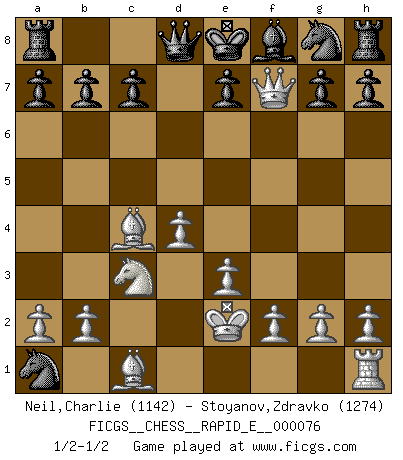 Last move : 1/2-1/2 2012 March 1 19:32:48 [Event "FICGS__CHESS__RAPID_E__000076"] [Site "FICGS"] [Date "2012.02.23"] [Round "1"] [White "Neil,Charlie"] [Black "Stoyanov,Zdravko"] [Result "1/2-1/2"] [WhiteElo "1142"] [BlackElo "1274"] 1.d4 d5 2.Nf3 Nc6 3.c4 dxc4 4.e3 Bg4 5.Bxc4 Nb4 6.Nc3 Bxf3 7.Qxf3 Nc2+ 8.Ke2 Nxa1 9.Qxf7+ Kd7 10.Qe6+ Ke8 11.Qf7+ Kd7 12.Qe6+ Ke8 13.Qf7+ 1/2-1/2 Queen's pawn game, Chigorin variation This chess game ended in a draw. Follow this game move after move (download)If cunning alone were needed to excel, women would be the best Chess players. (Albin) Das Schachspiel ist ein See, in welchem eine Mücke baden und ein Elefant ertrinken kann. (Emanuel Lasker) Fischer era un maestro de claridad y un Rey del posicionamiento astuto. Sus oponentes podían ver hacia donde se dirigía pero eran impotentes para detenerlo. (Bruce Pandolfini) Il n'y a pas de prix trop élevé au scalp de l'ennemi. (Koblentz) I take risks, sometimes patients die, but not taking risks causes more patients to die. So I guess my biggest problem is I've been cursed with the ability to do the math. (Gregory House, House M.D.)