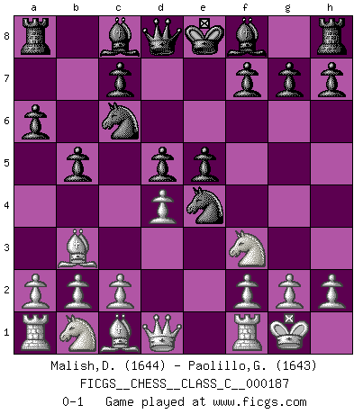 Last move : 0-1 2012 April 11 23:34:59 [Event "FICGS__CHESS__CLASS_C__000187"] [Site "FICGS"] [Date "2012.02.23"] [Round "1"] [White "Malish,Dmitriy"] [Black "Paolillo,Giampiero"] [Result "0-1"] [WhiteElo "1644"] [BlackElo "1643"] 1.e4 e5 2.Nf3 Nc6 3.Bb5 a6 4.Ba4 Nf6 5.O-O Nxe4 6.d4 b5 7.Bb3 d5 0-1 This chess game has been lost on time (started : 2012.02.23 20:48:57) Ruy Lopez : Open, 7.Bb3 Kingside Castling by player White (move 5) Player Black won this chess game. Follow this game move after move (download)The winner of the game is the player who makes the next-to-last mistake. (Savielly Tartakover) In der Schule lernt man nichts. Es ist nur Zeitverschwendung. (Robert James Fischer) Cuando tu no sabes absolutamente que mas hacer, es tiempo de entrar en pánico. (John van der Wiel) Les Cavaliers se révèlent fort utiles dans les positions fermées. D'habitude, les Fous sont un peu plus forts que les Cavaliers dans les positions ouvertes. Qu'on le veuille ou non, il restera toujours des exceptions ! You lose, general Kenobi. (General Grievous in Star Wars ep.3)