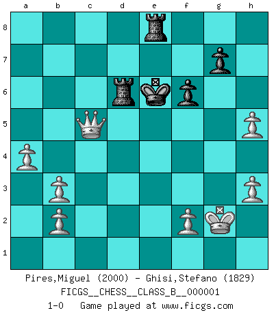 Last move : 1-0 2006 November 8 9:11:19 [Event "FICGS__CHESS__CLASS_B__000001"] [Site "FICGS"] [Date "2006.04.09"] [Round "1"] [White "Pires,Miguel"] [Black "Ghisi,Stefano"] [Result "1-0"] [WhiteElo "2000"] [BlackElo "1829"] 1.e4 e5 2.Bb5 c6 3.Ba4 d5 4.exd5 Qd5 5.Qf3 Nf6 6.Nc3 Qa5 7.Bb3 Na6 8.Qg3 Nc5 9.Qxe5+ Be6 10.Nf3 Ng4 11.Qe2 Nxb3 12.cxb3 O-O-O 13.d4 Bd6 14.h3 Nf6 15.O-O Rhe8 16.Be3 h6 17.Rfe1 Qf5 18.Ne5 Nd5 19.Rac1 Nxe3 20.Qxe3 f6 21.g4 Qh7 22.Nxc6 bxc6 23.Ne4 Bc7 24.Rxc6 Bd7 25.Rxc7+ Kxc7 26.Rc1+ Bc6 27.d5 Qxe4 28.Qxa7+ Kd6 29.Rxc6+ Ke5 30.Rc4 Qe1 31.Kg2 Qd2 32.Qc7+ Rd6 33.Rc3 Kxd5 34.Qc4+ Ke5 35.Re3+ Qxe3 36.Qb5+ Qc5 37.Qxc5+ Ke6 38.a4 h5 39.gxh5 1-0 King's pawn game Queenside Castling by player Black (move 12) Kingside Castling by player White (move 15) Player White won this chess game. Follow this game move after move (download)The game of Chess is not merely an idle amusement; several very valuable qualities of the mind are to be acquired and strengthened by it, so as to become habits ready on all occasions; for life is a kind of Chess. (Benjamin Franklin) Vom Schach wurde gesagt das Leben sei dafür nicht lange genug. Aber das ist der Fehler des Lebens, nicht des Schach'. (Irving Chernev) Una buena ofensiva y una buena defensa, comienzan ambas con un buen desarrollo. (Bruce A. Moon) Le système Elo représente seulement une moyenne. Il est simplement un indicateur de votre stabilité. (Anatoli Karpov) If you lose the game you should win the analysis! (Proverb)