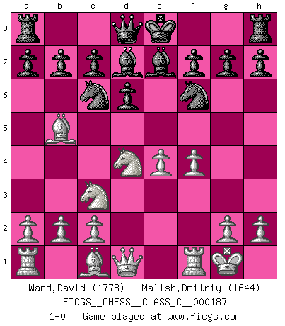 Last move : 1-0 2012 April 8 23:32:5 [Event "FICGS__CHESS__CLASS_C__000187"] [Site "FICGS"] [Date "2012.02.23"] [Round "1"] [White "Ward,David"] [Black "Malish,Dmitriy"] [Result "1-0"] [WhiteElo "1778"] [BlackElo "1644"] 1.e4 e5 2.Nf3 Nf6 3.Nc3 Nc6 4.Bb5 d6 5.d4 exd4 6.Nxd4 Bd7 7.O-O Be7 8.f4 1-0 This chess game has been lost on time (started : 2012.02.23 20:48:57) Petrov Three knights game Kingside Castling by player White (move 7) Player White won this chess game. Follow this game move after move (download)The passed Pawn is a criminal, who should be kept under lock and key. Mild measures, such as police surveillance, are not sufficient. (Aaron Nimzovich) Die Idee von Capablanca, Schach als Fach in den Schulen zu lehren, ist großartig. (Fidel Castro) Yo tuve un dolor de muelas en la primer partida. En el segundo juego, tuve un dolor de cabeza. En el tercero, tuve un ataque de reumatísmo. En la cuarta partida, no me sentía muy bien. ¿Y en el quinto juego? Bueno, ¿que acaso uno tiene que ganar todos los juegos?. (Siegbert Tarrasch) On a dit que l'homme se distingue de l'animal par le fait qu'il achète plus de livres qu'il ne peut en lire. Je voudrais suggérer qu'inclure à la liste des livres quelques livres d'échecs rendrait la distinction manifeste. (Edward Lasker) I would love to change the world, but they won't give me the source code. (Unknown)