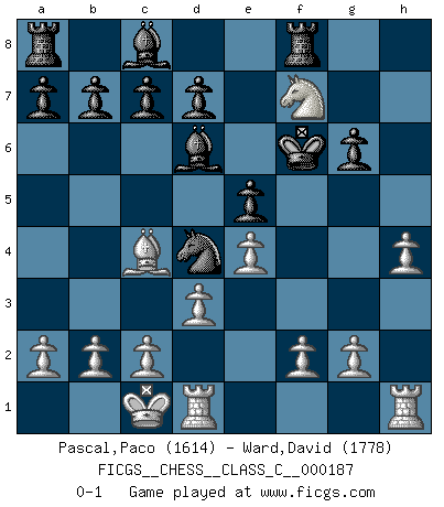 Last move : 0-1 2012 May 19 13:45:47 [Event "FICGS__CHESS__CLASS_C__000187"] [Site "FICGS"] [Date "2012.02.23"] [Round "1"] [White "Pascal,Paco"] [Black "Ward,David"] [Result "0-1"] [WhiteElo "1614"] [BlackElo "1778"] 1.e4 e5 2.Bc4 Nc6 3.Qh5 Qf6 4.Nf3 Nh6 5.d3 g6 6.Bg5 Qg7 7.Qxh6 Qxh6 8.Bxh6 Bxh6 9.Nc3 Bf8 10.Nd5 Bd6 11.Ng5 O-O 12.O-O-O Nd4 13.Nf6+ Kg7 14.Nfxh7 Rh8 15.h4 f6 16.Nxf6 Kxf6 17.Nf7 Rf8 0-1 Bishop's Opening Kingside Castling by player Black (move 11) Queenside Castling by player White (move 12) Player Black won this chess game. Follow this game move after move (download)Bobby just drops the pieces and they fall on the right squares. (Miguel Najdorf) Früher wurde jeder komplizierte Zug, jedes interessante Opfer mit großem Beifall und Enthusiasmus aufgenommen. Heute schaltet man einfach seinen Fritz an, und man kann sehen, was los ist, ob der Zug geht oder nicht. (Vladimir Kramnik) Un entendimiento minucioso de las típicas continuaciones de mate hacen de las mas complicadas combinaciones de sacrificio que conducen hacia ellas no solo no dificiles, sino casi un asunto de rutina. (Siegbert Tarrasch) Les Echecs mettent en conflit, non pas deux intelligences, mais deux volontés. (Lasker) As the days dwindle down... to a precious few. (Maxwell Anderson)