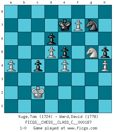 Last move : 1-0 2012 October 4 6:2:20 [Event "FICGS__CHESS__CLASS_C__000187"] [Site "FICGS"] [Date "2012.02.23"] [Round "1"] [White "Kuge,Tom"] [Black "Ward,David"] [Result "1-0"] [WhiteElo "1724"] [BlackElo "1778"] 1.d4 Nf6 2.c4 g6 3.Nc3 Bg7 4.e4 d6 5.Be2 O-O 6.g4 e5 7.d5 c6 8.g5 Ne8 9.h4 f5 10.gxf6 Qxf6 11.f3 h6 12.Be3 c5 13.Qd2 Kh7 14.O-O-O Na6 15.Nh3 Bxh3 16.Rxh3 Nac7 17.Rg1 Rg8 18.Nd1 a6 19.Nf2 h5 20.Rhg3 Bf8 21.Nh3 b5 22.f4 bxc4 23.f5 Ra7 24.Rxg6 Rxg6 25.fxg6+ Kg8 26.Qe1 Ng7 27.Qg3 Be7 28.Bg5 Qf8 29.Rf1 Qd8 30.Bxe7 Qxe7 31.Rf7 Qe8 32.Qe3 Nb5 33.Ng5 Qd8 34.Bxc4 Qa5 35.Bxb5 axb5 36.Rxa7 Qxa7 37.Qf3 c4 38.Kc2 b4 39.Qf7+ Qxf7 40.gxf7+ Kf8 41.a4 bxa3 42.bxa3 Ke7 43.a4 1-0 King's Indian : 5.Be2 Kingside Castling by player Black (move 5) Queenside Castling by player White (move 14) Player White won this chess game. Follow this game move after move (download)I had a toothache during the first game. In the second game I had a headache. In the third game it was an attack of rheumatism. In the fourth game, I wasn't feeling well. And in the fifth game? Well, must one have to win every game ? (Siegbert Tarrasch) Über Karpov: Er war und ist ein Vertreter der russischen Reaktionäre. Das steckt tief in seiner Seele, wehalb ich nicht nett mit ihm umgehen kann. (Viktor Kortschnoi) ¿Se han dado cuenta de que Fischer casi nunca ha tenido piezas malas? El las intercambia y las piezas malas se quedan con sus oponenets. (Yuri Balashov) C'est une question de caractère, Beaucoup de gens perdent leur motivation très vite. D'autres, ils sont rares, peuvent la conserver très longtemps. J'aime les échecs, encore aujourd'hui je suis heureux d'analyser des parties. J'aime toujours gagner, je déteste encore perdre. Bien jouer est important pour mon intégrité intellectuelle et morale. Et puis les échecs vivent en ce moment une période historique grâce à Internet. Ils se développent dans les systèmes éducatifs à travers le monde. Ils sortent de leur ghetto, et c'est mon rôle de mener à bien cette révolution. (Gary Kasparov) You can't play chess if you're groggy from pills. (Anatoly Karpov)