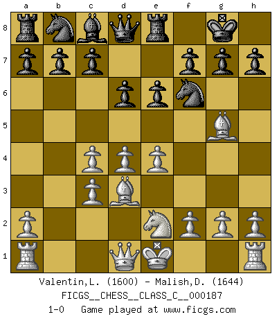 Last move : 1-0 2012 May 1 12:40:35 [Event "FICGS__CHESS__CLASS_C__000187"] [Site "FICGS"] [Date "2012.02.23"] [Round "1"] [White "Valentin,Laurentiu"] [Black "Malish,Dmitriy"] [Result "1-0"] [WhiteElo "1600"] [BlackElo "1644"] 1.d4 Nf6 2.c4 e6 3.Nc3 Bb4 4.Bg5 Bxc3+ 5.bxc3 O-O 6.e4 d6 7.Bd3 Re8 8.Ne2 1-0 This chess game has been lost on time (started : 2012.02.23 20:48:57) Nimzo-Indian : Leningrad variation Kingside Castling by player Black (move 5) Player White won this chess game. Follow this game move after move (download)We must make sure that Chess will not be like a dead language, very interesting, but for a very small group. (Sytze Faber) Bis zum Jahr 1971 verlief in meiner Schachkariere alles glatt. Dieses dramatische Match [Fischer-Taimanov 6:0] machte mein Leben zur Hölle. (Mark Taimanov) No hay otro maestro que tenga una voluntad terrífica de ganar. Al tablero, el irradía peligro y aún los oponentes mas fuertes tienden a congelarse como liebres cuando olfatean a una pantera. Aún sus debilidades son peligrosas. Con las blancas, su juego de apertura es predecible - te es posible hacer planes en su contra - pero es tan fuerte que tus planes casi nunca funcionan. En el juego medio, su precisión e invención son fabulosas y en finales, tú simplemente no le puedes vencer. (Experto Alemán anónimo) Le thème de l'attaque double intervient d'une manière ou d'une autre dans l'immense majorité des combinaisons. (Youri Averbakh) Unless in communicating with it one says exactly what one means, trouble is bound to result. (Alan Turing, about computers)
