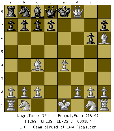 Last move : 1-0 2012 February 26 3:21:15 [Event "FICGS__CHESS__CLASS_C__000187"] [Site "FICGS"] [Date "2012.02.23"] [Round "1"] [White "Kuge,Tom"] [Black "Pascal,Paco"] [Result "1-0"] [WhiteElo "1724"] [BlackElo "1614"] 1.d4 e5 2.dxe5 f6 3.e4 Bc5 4.Bc4 Nh6 5.Bxh6 fxe5 6.Qh5+ g6 7.Qxe5+ Be7 8.Qxh8+ Bf8 9.Qxf8+ 1-0 Queen's pawn : Charlick (Englund) gambit Player White won this chess game. Follow this game move after move (download)Kasparov : J'adoube , Ivanchuk : S'il vous plaît ! (Garry Kasparov & Vassily Ivanchuk, Linares 1997) Ich würde die 30 stärksten Spieler der USA im Simultanspiel besiegen. (José Raúl Capablanca) Nos gusta pensar. (Gary Kasparov) D'abord les bases : Jouez et étudiez, puis étudiez et jouez, ensuite jouez et étudiez, puis étudiez et jouez. Deuxièmement : Donnez toujours le meilleur de vous-même ! (Ken Smith) After growing wildly for years, the field of computing appears to be reaching its infancy. (John Pierce)