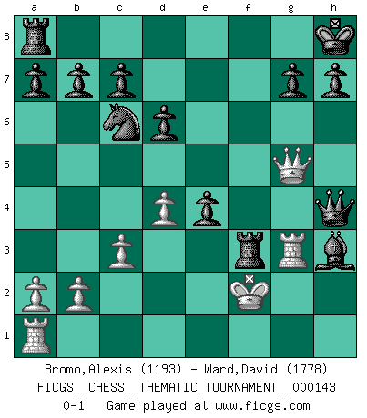 Last move : 0-1 2012 March 15 17:8:50 [Event "FICGS__CHESS__THEMATIC_TOURNAMENT__000143"] [Site "FICGS"] [Date "2012.02.23"] [Round "1"] [White "Bromo,Alexis"] [Black "Ward,David"] [Result "0-1"] [WhiteElo "1193"] [BlackElo "1778"] 1.e4 e5 2.c3 f5 3.f3 fxe4 4.fxe4 Nf6 5.d3 Nc6 6.Nf3 Be7 7.Be3 d6 8.h3 O-O 9.Be2 Bd7 10.d4 Nxe4 11.Bc4+ Kh8 12.Nbd2 Bh4+ 13.g3 Nxg3 14.Rg1 Bxh3 15.Bf1 Nxf1 16.Bf2 Bxf2+ 17.Kxf2 Nxd2 18.Qxd2 e4 19.Rg3 Qh4 20.Qg5 Rxf3+ 0-1 Variation Lopez Opening : Lopez Opening Kingside Castling by player Black (move 8) Player Black won this chess game. Follow this game move after move (download)Discovered check is the dive bomber of the Chessboard. (Reuben Fine) Die Elozahlen sind sehr schlecht für das Schach. Jetzt ist Schach eine Sportindustrie, die darauf zielt Elopunkte zu machen. (Miguel Najdorf) En la perfecta combinación de Ajedrez como en una historia corta de primera clase, toda la trama y contra trama deberá conducir hacia un final sorprendente, el interes no es mitigado hasta el último momento. (Yates and Winter) Toutes choses étant égales, c'est la conviction qui gagne. Alliée à une volonté de vaincre, elle sert de détonateur, suscite des idées, disperse les doutes et aide à penser clairement. (Robert Fischer) Beep ! (R2D2 in Star Wars ep.3)