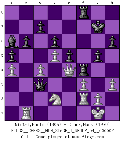 Last move : 0-1 2007 March 21 16:51:23 [Event "FICGS__CHESS__WCH_STAGE_1_GROUP_04__000002"] [Site "FICGS"] [Date "2007.01.16"] [Round "1"] [White "Nistri,Paolo"] [Black "Clark,Mark"] [Result "0-1"] [WhiteElo "1306"] [BlackElo "1970"] 1.d4 Nf6 2.c4 e6 3.Nc3 Bb4 4.Nf3 b6 5.e3 Bb7 6.Bd3 Bxc3+ 7.bxc3 O-O 8.O-O d6 9.Re1 Qe7 10.e4 e5 11.d5 Nbd7 12.Bg5 h6 13.Bd2 Nc5 14.Qc2 a5 15.Rab1 Nh5 16.Be3 Nxd3 17.Qxd3 Ba6 18.a4 Qf6 19.Re2 Nf4 20.Bxf4 Qxf4 21.Reb2 f5 22.Nd2 fxe4 23.Nxe4 Rf7 24.f3 g5 25.Rf2 Qf5 26.Qe2 Qg6 27.Nd2 Qc2 28.Qd1 Qxc3 29.Qe2 Raf8 30.Qe4 Kg7 31.h3 Rf4 0-1 Nimzo-Indian : Three knights variation Kingside Castling by player Black (move 7) Kingside Castling by player White (move 8) Player Black won this chess game. Follow this game move after move (download)All my games are real. (Bobby Fischer) Wenn ich Weiß habe gewinne ich weil ich Weiß habe, wenn ich Schwarz habe gewinne ich weil ich Bogoljubov bin. (Efim Bogoljubov) Si el ingenio solamente fuese necesario para lucirse, las mujeres serían las mejores jugadoras de Ajedrez del mundo. (Albin) J'ai toujours senti une vague pitié pour l'homme qui ne connaît rien aux échecs, tout comme j'en aurais pour un homme ignorant de l'amour. Les Echecs, comme la musique ou comme l'amour, ont le pouvoir de rendre heureux. (Siegbert Tarrasch) Memory is a way of holding onto the things you love, the things you are, the things you never want to lose. (from the television show: The Wonder Years)
