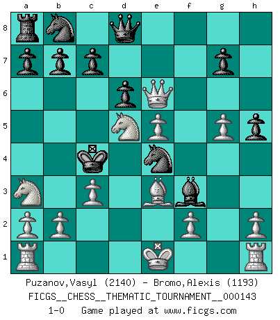 Last move : 1-0 2012 April 24 21:45:23 [Event "FICGS__CHESS__THEMATIC_TOURNAMENT__000143"] [Site "FICGS"] [Date "2012.02.23"] [Round "1"] [White "Puzanov,Vasyl"] [Black "Bromo,Alexis"] [Result "1-0"] [WhiteElo "2140"] [BlackElo "1193"] 1.e4 e5 2.c3 f5 3.exf5 Nf6 4.d4 d6 5.g4 h5 6.g5 Ne4 7.Nf3 Be7 8.dxe5 Bxf5 9.Nh4 Bd7 10.Ng6 Rg8 11.Bc4 Bg4 12.Qd5 Bf3 13.Qxg8+ Kd7 14.Qe6+ Kc6 15.Nxe7+ Kb6 16.Nd5+ Kc5 17.Be3+ Kxc4 18.Na3+ 1-0 Variation Lopez Opening : Lopez Opening Player White won this chess game. Follow this game move after move (download)Chess books should be used as we use glasses: to assist the sight, although some players make use of them as if they thought they conferred sight. (Jose Raul Capablanca) Wenn ich gewinne bin ich ein Genie. Wenn nicht, dann bin ich keines. (Robert James Fischer) Hoy en día, si tu no eres un Gran Maestro a los 14 años, es mejor que lo olvides. (Anand Viswanathan) Je fais ceci parce que dans cinquante coups j'obtiendrai cela; je m'appelle Mikhail Moisevitch Botvinnik. (Botvinnik) Secret operations are essential in war; upon them the army relies to make its every move. (Sun Tzu)