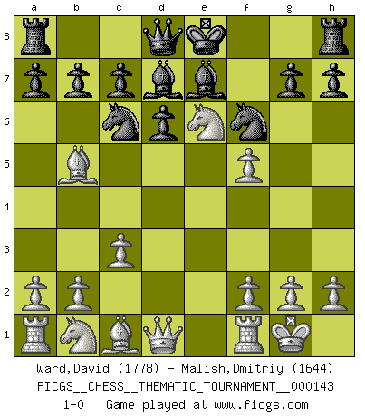 Last move : 1-0 2012 April 9 23:32:21 [Event "FICGS__CHESS__THEMATIC_TOURNAMENT__000143"] [Site "FICGS"] [Date "2012.02.23"] [Round "1"] [White "Ward,David"] [Black "Malish,Dmitriy"] [Result "1-0"] [WhiteElo "1778"] [BlackElo "1644"] 1.e4 e5 2.c3 f5 3.exf5 Nf6 4.Nf3 Nc6 5.Bb5 d6 6.d4 exd4 7.Nxd4 Bd7 8.O-O Be7 9.Ne6 1-0 This chess game has been lost on time (started : 2012.02.23 20:49:40) Variation Lopez Opening : Lopez Opening Kingside Castling by player White (move 8) Player White won this chess game. Follow this game move after move (download)The laws of Chess do not permit a free choice: you have to move whether you like it or not. (Emanuel Lasker) Schach ist Kampf, hauptsächlich jedoch gegen die eigenen Fehler. (Savielly Grigorievitsch Tartakower) Todos los jugadores de Ajedrez deberían tener un pasatiempo. (Savielly Tartakower) Je ne suis pas le dernier à jouer lâchement des coups douteux pendant le zeïtnot de l'adversaire pour l'achever: en effet les coups qui font le plus peur sont ceux que l'on ne comprend pas. Je me fais souvent peur quand je joue. (Un professeur anonyme) The leaves of memory seemed to make a mournful rustling in the dark. (Henry Wadsworth Longfellow)