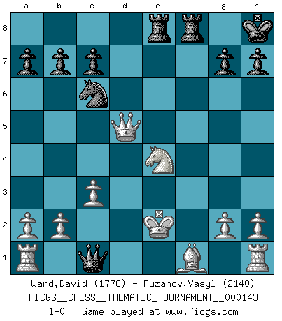 Last move : 1-0 2012 October 5 9:19:21 [Event "FICGS__CHESS__THEMATIC_TOURNAMENT__000143"] [Site "FICGS"] [Date "2012.02.23"] [Round "1"] [White "Ward,David"] [Black "Puzanov,Vasyl"] [Result "1-0"] [WhiteElo "1778"] [BlackElo "2140"] 1.e4 e5 2.c3 f5 3.exf5 Nf6 4.Nf3 e4 5.Qe2 Be7 6.Ng5 O-O 7.Nxe4 Nxe4 8.Qxe4 d5 9.Qc2 Bxf5 10.d3 Bc5 11.Be3 Bxe3 12.fxe3 Qg5 13.e4 dxe4 14.dxe4 Bxe4 15.Qxe4 Qc1+ 16.Ke2 Nc6 17.Qd5+ Kh8 18.Nd2 Rae8+ 19.Ne4 1-0 This chess game has been lost on time (started : 2012.02.23 20:49:40) Variation Lopez Opening : Lopez Opening Kingside Castling by player Black (move 6) Player White won this chess game. Follow this game move after move (download)The isolated Pawn casts gloom over the entire chessboard. (Aaron Nimzovich) Ich verstehe Aljechins Kombinationen ganz gut; aber woher er diese Angriffschancen bekommt und wie er die Eröffnung behandelt das ist für mich ein Buch mit sieben Siegeln. (Rudolf Spielmann) El jugador blanco perdió porque fallo en recordar la coreccta continuación y tuvo que pensar por sí mismo las movidas. (Siegbert Tarrasch) Le plus grand jeu de l'esprit jamais inventé, plus vous l'apprenez, plus vous y prenez du plaisir. (Garry Kasparov) It is the aim of the modern school, not to treat every position according to one general law, but according to the principle inherent in the position. (Richard Reti)