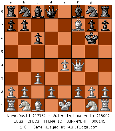 Last move : 1-0 2012 March 4 21:23:46 [Event "FICGS__CHESS__THEMATIC_TOURNAMENT__000143"] [Site "FICGS"] [Date "2012.02.23"] [Round "1"] [White "Ward,David"] [Black "Valentin,Laurentiu"] [Result "1-0"] [WhiteElo "1778"] [BlackElo "1600"] 1.e4 e5 2.c3 f5 3.Bd3 f4 4.Qh5+ Ke7 5.Qxe5+ Kf7 6.Bc4+ d5 7.Bxd5+ Kg6 8.Qxf4 c6 9.Bf7+ 1-0 Variation Lopez Opening : Lopez Opening Player White won this chess game. Follow this game move after move (download)The combination player thinks forward; he starts from the given position, and tries the forceful moves in his mind. (Emanuel Lasker) Wenn du gegen Bobby spielst, ist es keine Frage von gewinnen oder verlieren. Es ist eine Frage des Überlebens. (Boris Vassilievich Spassky) Un mal plan es mejor que no tener ningún plan. (Frank Marshall) Les échecs sont utiles à l'exercice de la faculté de penser et à celle de l'imagination. Car nous devons posséder une méthode élaborée pour atteindre des buts partout où nous devons conduire notre raison. (Leibnitz) Always be a first-rate version of yourself, instead of a second-rate version of somebody else. (Judy Garland)