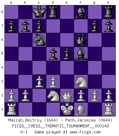 Last move : 0-1 2012 September 2 4:34:8 [Event "FICGS__CHESS__THEMATIC_TOURNAMENT__000143"] [Site "FICGS"] [Date "2012.02.23"] [Round "1"] [White "Malish,Dmitriy"] [Black "Pech,Jaroslav"] [Result "0-1"] [WhiteElo "1644"] [BlackElo "0644"] 1.e4 e5 2.c3 f5 3.exf5 Nf6 4.d3 Qe7 5.Nf3 d5 6.Qe2 Nc6 7.Bg5 Bxf5 8.Bxf6 Qxf6 9.Nbd2 O-O-O 0-1 This chess game has been lost on time (started : 2012.02.23 20:49:40) Variation Lopez Opening : Lopez Opening Queenside Castling by player Black (move 9) Player Black won this chess game. Follow this game move after move (download)There is only one thing Fischer does in Chess without pleasure: to lose ! (Boris Spassky) Fallen sollten polizeilich verboten werden. (Savielly Grigorievitsch Tartakower) En partidas rápidas, el Caballo es mas poderoso que el Alfil. (Vlastimil Hort) Votre seul travail dans les ouvertures est d'obtenir un milieu de partie jouable. (Lajos Portish) It's not the will to win, but the will to prepare to win that makes the difference. (Bear Bryant)