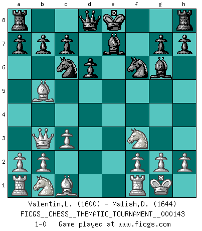 Last move : 1-0 2012 May 1 12:40:35 [Event "FICGS__CHESS__THEMATIC_TOURNAMENT__000143"] [Site "FICGS"] [Date "2012.02.23"] [Round "1"] [White "Valentin,Laurentiu"] [Black "Malish,Dmitriy"] [Result "1-0"] [WhiteElo "1600"] [BlackElo "1644"] 1.e4 e5 2.c3 f5 3.exf5 Nf6 4.d4 exd4 5.Qxd4 Nc6 6.Qd1 d6 7.Nf3 Bxf5 8.Bb5 Be7 9.Qb3 Bg6 10.O-O 1-0 This chess game has been lost on time (started : 2012.02.23 20:49:40) Variation Lopez Opening : Lopez Opening Kingside Castling by player White (move 10) Player White won this chess game. Follow this game move after move (download)It began to feel as though you were playing against Chess itself. - On playing against Robert Fischer. (Walter Shipman) Wie, soll nun auch die Opposition abgeschafft werden? Ja, es tut mir leid, Ihnen diesen Schmerz nicht ersparen zu können. (Aaron Nimzowitsch) Cuando me preguntan: -¿Cual es el secreto que te hace hacer mejores movidas que tus oponentes?, Yo respondo: Me da gusto que me pregunten eso, porque, como veran, hay una simple razón. Yo pienso mis propias movidas y dejo a mi oponente que el piense las suyas. (Alexander Alekhine) Des idées, des idées, j'en ai cent, j'en ai mille. Des bonnes, des mauvaises, applicables, irréalisables... Il suffit de faire le tri ! (Roos) All men can see these tactics whereby I conquer, but what none can see is the strategy out of which victory is evolved. (Sun Tzu)