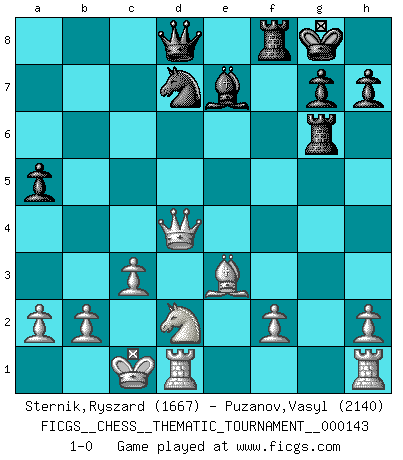 Last move : 1-0 2012 May 30 20:52:5 [Event "FICGS__CHESS__THEMATIC_TOURNAMENT__000143"] [Site "FICGS"] [Date "2012.02.23"] [Round "1"] [White "Sternik,Ryszard"] [Black "Puzanov,Vasyl"] [Result "1-0"] [WhiteElo "1667"] [BlackElo "2140"] 1.e4 e5 2.c3 f5 3.exf5 Nf6 4.Be2 Be7 5.Nf3 d6 6.d4 e4 7.Ng5 Bxf5 8.Qb3 d5 9.Qxb7 Nbd7 10.Qc6 Rb8 11.Ne6 Bxe6 12.Qxe6 Rb6 13.Qh3 c5 14.Bh5+ Nxh5 15.Qxh5+ Rg6 16.Qxd5 Rxg2 17.Qxe4 Rg6 18.Be3 O-O 19.Nd2 cxd4 20.Qxd4 a5 21.O-O-O 1-0 Variation Lopez Opening : Lopez Opening Kingside Castling by player Black (move 18) Queenside Castling by player White (move 21) Player White won this chess game. Follow this game move after move (download)Chess is mental torture. (Garry Kasparov) Der vorletzte Fehler gewinnt. (Savielly Grigorievitsch Tartakower) El estómago es una parte esencial del maestro de Ajedrez. (Bent Larsen) Ce qui est bien, c'est d'avoir tout un tas de pièces en prise : l'adversaire ne peut en prendre qu'une à la fois. Cité par Thierry Audin. But they are useless. They can only give you answers. (Pablo Picasso, about computers)
