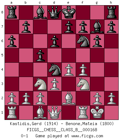Last move : 0-1 2012 May 15 13:14:16 [Event "FICGS__CHESS__CLASS_B__000168"] [Site "FICGS"] [Date "2012.02.24"] [Round "1"] [White "Kastidis,Gerd"] [Black "Benone,Mateia"] [Result "0-1"] [WhiteElo "1914"] [BlackElo "1800"] 1.e4 c5 2.Nc3 Nc6 3.f4 g6 4.Nf3 Bg7 5.Bb5 Nd4 6.O-O a6 7.Be2 d6 8.d3 Nf6 0-1 This chess game has been lost on time (started : 2012.02.24 9:13:57) Sicilian : Grand Prix attack Kingside Castling by player White (move 6) Player Black won this chess game. Follow this game move after move (download)Why must I lose to this idiot ? (Aron Nimzovich) Mutter, ich bin eben Ex-Weltmeister geworden. --beim nach Hause Kommen nach dem Verlust des WM-Titels an Mihail Botvinnik -- (Mikhail Nekhemyevich Tal) Es el objetivo de la escuela moderna no tratar cada posición de acuerdo a una regla general, sino de acuerdo al principio inherente en la posición. (Richard Reti) Il (Jacob Murray) ne joue pas pour le bon coup, mais pour le meilleur. (Eloi Relange) Never risk one's whole fortune unless supported by one's entire army. (Niccolo Machiavelli)