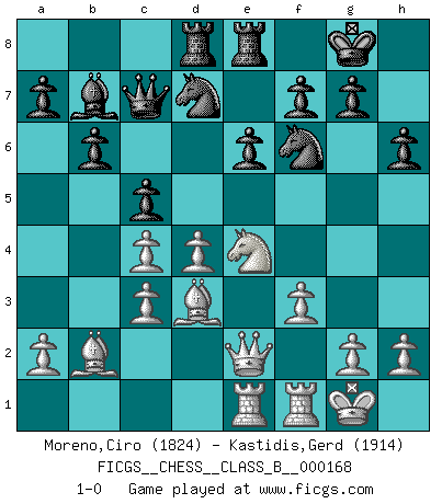 Last move : 1-0 2012 September 23 8:7:22 [Event "FICGS__CHESS__CLASS_B__000168"] [Site "FICGS"] [Date "2012.02.24"] [Round "1"] [White "Moreno,Ciro"] [Black "Kastidis,Gerd"] [Result "1-0"] [WhiteElo "1824"] [BlackElo "1914"] 1.d4 Nf6 2.Nf3 e6 3.c4 Bb4+ 4.Nc3 O-O 5.e3 b6 6.Bd3 Bb7 7.O-O Bxc3 8.bxc3 c5 9.Nd2 d5 10.Ba3 Nbd7 11.f3 Re8 12.e4 dxe4 13.Nxe4 Qc7 14.Qe2 Rad8 15.Rae1 h6 16.Bb2 1-0 This chess game has been lost on time (started : 2012.02.24 9:13:57) Queen's pawn game Kingside Castling by player Black (move 4) Kingside Castling by player White (move 7) Player White won this chess game. Follow this game move after move (download)Fischer, who may or may not be mad as a hatter, has every right to be horrified. (Jeremy Silman) Wer sich die Fähigkeit anerziehen will im Schach selbstständig zu denken, der muß alles meiden, was leblos ist: ausgeklügelte Theorien, die sich auf sehr wenige Beispiele und eine Menge Hirngespinste stützen. (Emanuel Lasker) Los tropiezos estan todos ahí en el tablero, esperando que se cometan. (Savielly Tartakover) La menace est plus forte que l'exécution. (Aaron Nimzovitch) If I had no sense of humor, I would long ago have committed suicide. (Mahatma Gandhi)