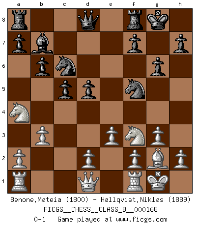 Last move : 0-1 2012 May 28 2:22:37 [Event "FICGS__CHESS__CLASS_B__000168"] [Site "FICGS"] [Date "2012.02.24"] [Round "1"] [White "Benone,Mateia"] [Black "Hallqvist,Niklas"] [Result "0-1"] [WhiteElo "1800"] [BlackElo "1889"] 1.Nf3 c5 2.c4 g6 3.g3 Bg7 4.Bg2 Nc6 5.Nc3 e6 6.b3 Nge7 7.Bb2 O-O 8.O-O b6 9.Na4 Bxb2 10.Nxb2 Nf5 11.e3 d5 12.Na4 Bb7 13.cxd5 exd5 0-1 This chess game has been lost on time (started : 2012.02.24 9:13:57) Reti Opening Kingside Castling by player Black (move 7) Kingside Castling by player White (move 8) Player Black won this chess game. Follow this game move after move (download)White lost because he failed to remember the right continuation and had to think up the moves himself. (Siegbert Tarrasch) Wer der Ansicht ist, daß alle Schachspieler verrückt sind, wird durch Studium des Lebens von Emil Josef Diemer nicht auf andere Gedanken kommen. (Hans Ree) El Ajedrez es parte de una cultura y si una cultura esta en decadencia, entonces también el Ajedrez declinará. (Mikhail Botvinnik) Echiquier : carré parfait, comme la Jérusalem nouvelle décrite par l'auteur de l'Apocalypse, huit cases sur huit, exaltation du chiffre 4, symbole du cosmos aux quatre horizons... où le noir et le blanc, l'ombre et la lumière, le mal et le bien s'entremêlent et se conjuguent. (Robert Couffignal, Le Gambit du poète) If only people were all showed a certain minimum level of niceness; if only people didn't retract verbal draw offers (without draw box ticked) on ficgs; if only people didn't kill; if only people didn't run concentration / extermination camps, if only people didn't drop nuclear bombs on Hiroshima and Nagasaki, and so on - it would be a much more beautiful world. But sadly, things are not so... (Normajean Yates)