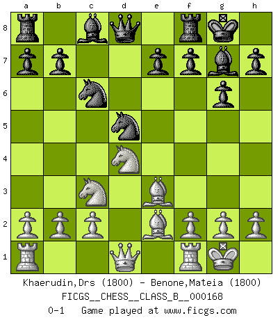 Last move : 0-1 2012 April 27 0:12:23 [Event "FICGS__CHESS__CLASS_B__000168"] [Site "FICGS"] [Date "2012.02.24"] [Round "1"] [White "Khaerudin,Drs"] [Black "Benone,Mateia"] [Result "0-1"] [WhiteElo "1800"] [BlackElo "1800"] 1.e4 c5 2.Nf3 Nc6 3.d4 cxd4 4.Nxd4 g6 5.Be2 Bg7 6.Be3 Nf6 7.Nc3 O-O 8.O-O d5 9.exd5 Nxd5 0-1 This chess game has been lost on time (started : 2012.02.24 9:13:57) Sicilian defense Kingside Castling by player Black (move 7) Kingside Castling by player White (move 8) Player Black won this chess game. Follow this game move after move (download)Help your pieces so they can help you. (Paul Morphy) Schach ist das Spiel, das die Verrückten gesund hält. (Albert Einstein) Las Aperturas te enseñan aperturas. ¡Los Finales te enseñan Ajedrez!. (Stephan Gerzadowicz) Demandez au pauvre Cg1 ce qu'il en pense. Eduard Gufeld à propos de la variante Saemisch de l'Est-Indienne. You cannot beat a roulette table unless you steal money from it. (Albert Einstein)
