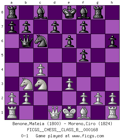 Last move : 0-1 2012 August 26 15:12:59 [Event "FICGS__CHESS__CLASS_B__000168"] [Site "FICGS"] [Date "2012.02.24"] [Round "1"] [White "Benone,Mateia"] [Black "Moreno,Ciro"] [Result "0-1"] [WhiteElo "1800"] [BlackElo "1824"] 1.Nf3 Nf6 2.c4 c5 3.Nc3 Nc6 4.d4 cxd4 5.Nxd4 e6 6.Bg5 h6 7.Bh4 Qb6 8.Bxf6 gxf6 9.Nb3 f5 10.e3 Rg8 0-1 This chess game has been lost on time (started : 2012.02.24 9:13:57) Reti Opening Player Black won this chess game. Follow this game move after move (download)That's what Chess is all about. One day you give your opponent a lesson, the next day he gives you one. (Bobby Fischer) Jede Eröffnung ist gut genug um gespielt zu werden, wenn nur ihr Ruf schlecht genug ist. (Savielly Grigorievitsch Tartakower) Cuando me preguntan: -¿Cual es el secreto que te hace hacer mejores movidas que tus oponentes?, Yo respondo: Me da gusto que me pregunten eso, porque, como veran, hay una simple razón. Yo pienso mis propias movidas y dejo a mi oponente que el piense las suyas. (Alexander Alekhine) Nous vivons dans un monde échiquéen : chaque jour qui passe est un défi à relever. (Philosophe Sasha) We're missing something. (Gregory House, House M.D.)