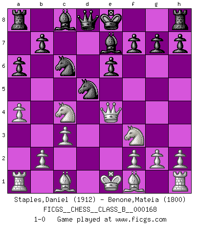 Last move : 1-0 2012 August 25 14:53:13 [Event "FICGS__CHESS__CLASS_B__000168"] [Site "FICGS"] [Date "2012.02.24"] [Round "1"] [White "Staples,Daniel"] [Black "Benone,Mateia"] [Result "1-0"] [WhiteElo "1912"] [BlackElo "1800"] 1.e4 c5 2.c3 Nf6 3.e5 Nd5 4.Nf3 d6 5.d4 cxd4 6.Qxd4 e6 7.Nbd2 a6 8.exd6 Nc6 9.Qe4 Bxd6 10.Nc4 Be7 11.a4 1-0 This chess game has been lost on time (started : 2012.02.24 9:13:57) Sicilian : Alapin's variation (2.c3) Player White won this chess game. Follow this game move after move (download)If your opponent cannot do anything active, then don't rush the position; instead you should let him sit there, suffer, and beg you for a draw. (Jeremy Silman) Ich moechte nie einem Club beitreten, der Leute wie mich als Mitglieder aufnimmt. (Woody Allen) No soy una persona materialista y por eso, no resiento la falta o pérdida del dinero. La ausencia de cosas mundanas carece de importancia. Ya que el Ajedrez es una forma en la que puedo ser tan materialista como yo desee sin tener la necesidad de vender mi alma. (Jamie Walter Adams) Les échecs sont utiles à l'exercice de la faculté de penser et à celle de l'imagination. Car nous devons posséder une méthode élaborée pour atteindre des buts partout où nous devons conduire notre raison. (Leibnitz) Lottery : A tax on people who are bad at math. (Author unknown)