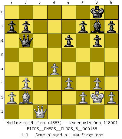 Last move : 1-0 2012 August 30 16:0:15 [Event "FICGS__CHESS__CLASS_B__000168"] [Site "FICGS"] [Date "2012.02.24"] [Round "1"] [White "Hallqvist,Niklas"] [Black "Khaerudin,Drs"] [Result "1-0"] [WhiteElo "1889"] [BlackElo "1800"] 1.d4 Nf6 2.g3 d5 3.Bg2 c6 4.Nf3 g6 5.O-O Bg7 6.b3 O-O 7.Bb2 Bg4 8.c4 Qb6 9.Ne5 Be6 10.Nc3 Nbd7 11.cxd5 cxd5 12.e3 Rac8 13.Nxd5 Nxd5 14.Nxd7 Bxd7 15.Bxd5 e6 16.Bg2 Bc6 17.Qd2 Bxg2 18.Kxg2 Rc7 19.Rac1 Rfc8 20.Rxc7 Rxc7 21.Rc1 Rxc1 22.Qxc1 1-0 Queen's pawn game Kingside Castling by player White (move 5) Kingside Castling by player Black (move 6) Player White won this chess game. Follow this game move after move (download)The beauty of a move lies not in its' appearance but in the thought behind it. (Siegbert Tarrasch) Es ist peinlich, dass ich nie Weltmeister wurde. Es wäre leicht, Leonid Breschnjew als Ursache vorzuschieben, dessen Apparat den Vorzeigekommunisten Anatoli Karpow in allem unterstützte. Aber Garri Kasparow zum Beispiel, der ebenfalls von den Sowjets unerwünscht war, hat trotz der Widerstände den WM-Titel erobert. (Viktor Kortschnoi) La última cosa en que Fischer estaba interesado era en tonterías, siempre y cuando el Ajedrez estuviera involucrado. (Elie Agur) La tactique est l'élément le plus important du milieu de jeu. (Siegbert Tarrasch) The intuitive mind is a sacred gift; the rational mind is a faithful servant. We have created a society that honors the servant but has forgotten the gift. (Albert Einstein)