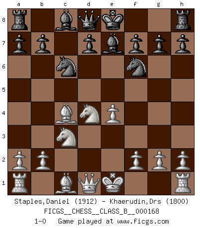 Last move : 1-0 2012 May 1 0:41:29 [Event "FICGS__CHESS__CLASS_B__000168"] [Site "FICGS"] [Date "2012.02.24"] [Round "1"] [White "Staples,Daniel"] [Black "Khaerudin,Drs"] [Result "1-0"] [WhiteElo "1912"] [BlackElo "1800"] 1.e4 c5 2.c3 e5 3.Nf3 Nc6 4.Bc4 Be7 5.d4 exd4 6.cxd4 cxd4 7.Nxd4 Nf6 8.Nc3 1-0 This chess game has been lost on time (started : 2012.02.24 9:13:57) Sicilian : Alapin's variation (2.c3) Player White won this chess game. Follow this game move after move (download)Examine moves that smite! A good eye for smites is far more important than a knowledge of strategical principles. (Purdy) Karpov ist ein Museumsstück. (Garry Kasparov) EL Ajedrez es como la vida. (Boris Spassky) J'ai toujours senti une vague pitié pour l'homme qui ne connaît rien aux échecs, tout comme j'en aurais pour un homme ignorant de l'amour. Les Echecs, comme la musique ou comme l'amour, ont le pouvoir de rendre heureux. (Siegbert Tarrasch) Life is like a ten-speed bicycle: most of us have gears we never use. (Charles M. Schulz)