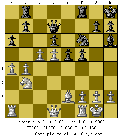 Last move : 0-1 2012 August 31 16:12:2 [Event "FICGS__CHESS__CLASS_B__000168"] [Site "FICGS"] [Date "2012.02.24"] [Round "1"] [White "Khaerudin,Drs"] [Black "Meli,Cosimo Leonardo"] [Result "0-1"] [WhiteElo "1800"] [BlackElo "1988"] 1.e4 c5 2.Nf3 d6 3.d4 cxd4 4.Nxd4 Nf6 5.Nc3 a6 6.Be2 e5 7.Nb3 Be7 8.O-O Nc6 9.Bg5 O-O 10.Bxf6 Bxf6 11.Nd5 Bg5 12.c3 Be6 13.Nd2 Bxd5 14.exd5 Ne7 15.Nf3 Bh6 16.c4 Rb8 17.Nd2 f5 18.b4 Qd7 19.Nb3 Kh8 20.a4 Ng8 21.c5 Nf6 0-1 This chess game has been lost on time (started : 2012.02.24 9:13:57) Sicilian : Najdorf, Opovcensky variation Kingside Castling by player White (move 8) Kingside Castling by player Black (move 9) Player Black won this chess game. Follow this game move after move (download)By this measure (on the gap between Fischer & his contemporaries), I consider him the greatest world champion. (Garry Kasparov) Das Blackmar-Diemer-Gambit verändert den ganzen Menschen! (Emil Joseph Diemer) No solamente yo pronostico su triunfo sobre Botvinnik, sino que me adelanto y digo que probablemente Fischer es el jugador de Ajedrez mas grande que haya existido. (John Collins) Pour moi, les échecs ne sont pas un jeu mais un art. (Alexandre Alekhine) There are two types of people in this world, good and bad. The good sleep better, but the bad seem to enjoy the waking hours much more. (Woody Allen)