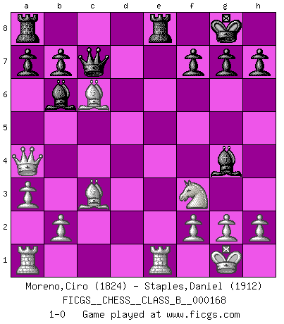 Last move : 1-0 2012 October 9 21:58:11 [Event "FICGS__CHESS__CLASS_B__000168"] [Site "FICGS"] [Date "2012.02.24"] [Round "1"] [White "Moreno,Ciro"] [Black "Staples,Daniel"] [Result "1-0"] [WhiteElo "1824"] [BlackElo "1912"] 1.d4 Nf6 2.Nf3 e6 3.c4 d5 4.Nc3 Be7 5.Bf4 O-O 6.e3 c5 7.dxc5 Bxc5 8.cxd5 Nxd5 9.Nxd5 exd5 10.a3 Nc6 11.Bd3 Bb6 12.O-O d4 13.exd4 Nxd4 14.Be5 Nc6 15.Bc3 Bg4 16.Re1 Qd7 17.Be4 Rfe8 18.Qa4 Qc7 19.Bxc6 1-0 Queen's pawn game Kingside Castling by player Black (move 5) Kingside Castling by player White (move 12) Player White won this chess game. Follow this game move after move (download)During a Chess competition a Chessmaster should be a combination of a beast of prey and a monk. (Alexander Alekhine) Wenn man heute mit 14 Jahren noch kein GM ist, kann man es vergessen. (Viswanathan Anand) No es tiempo de jugar al Ajedrez cuando la casa esta en llamas. (Proverbio Italiano) Les sacrifices démontrent seulement que quelqu'un a gaffé. (Savielly Tartacover) The real voyage of discovery consists not in seeking new lands but in seeing with new eyes. (Marcel Proust)