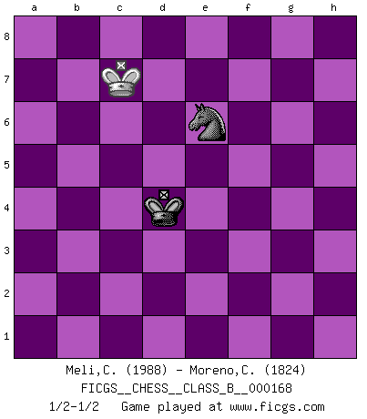 Last move : 1/2-1/2 2013 June 5 6:44:23 [Event "FICGS__CHESS__CLASS_B__000168"] [Site "FICGS"] [Date "2012.02.24"] [Round "1"] [White "Meli,Cosimo Leonardo"] [Black "Moreno,Ciro"] [Result "1/2-1/2"] [WhiteElo "1988"] [BlackElo "1824"] 1.e4 c5 2.c3 d5 3.exd5 Qxd5 4.Nf3 Nc6 5.Na3 Bg4 6.Be2 O-O-O 7.d3 e5 8.Nc4 Nf6 9.Ne3 Qd7 10.Nxg4 Nxg4 11.O-O f5 12.a4 Bd6 13.h3 Nf6 14.Qb3 Na5 15.Qa2 Qe7 16.Re1 Kb8 17.Bf1 Rhe8 18.d4 cxd4 19.Nxd4 Qd7 20.Nb5 Bf8 21.b4 Nc6 22.Na3 Ne4 23.Qc2 a5 24.bxa5 Bc5 25.Be3 Bxe3 26.Rxe3 Nxa5 27.Bb5 Nc6 28.Rb1 Re6 29.Bd3 f4 30.Bxe4 fxe3 31.Nc4 exf2+ 32.Kxf2 Qe7 33.Kg3 Qf7 34.Kh2 Re7 35.Qe2 Rc7 36.Kh1 Na7 37.Na5 Rd5 38.Bxd5 Qxd5 39.Qa6 Qe4 40.Rb3 Rd7 41.Qc4 Qxc4 42.Nxc4 Rd5 43.Kg1 Nc8 44.Kf2 Rc5 45.Nd2 Kc7 46.Ne4 Ra5 47.Rb4 Nb6 48.Rb5 Rxb5 49.axb5 Nc4 50.Ng5 Kb6 51.Nxh7 Kxb5 52.Ke2 Nd6 53.Kd3 Kc5 54.Nf8 e4+ 55.Kc2 Kd5 56.Ng6 Nc4 57.g4 Ke6 58.Kd1 Kf6 59.Nh4 Nd6 60.Ng2 g5 61.Ke2 Ke5 62.Ke3 Nc4+ 63.Ke2 Kf6 64.Kf2 Nb2 65.Ke2 Ke5 66.h4 gxh4 67.Nxh4 Kf4 68.Ng2+ Kxg4 69.Ke3 Kf5 70.Kd4 Nd3 71.Nh4+ Kf4 72.Ng6+ Kf3 73.Nh4+ Kg4 74.Kxe4 Nf2+ 75.Kd5 Kxh4 76.c4 Kg5 77.Ke6 Nd3 78.Kd6 Kf4 79.Kc7 Ke4 80.Kxb7 Kd4 81.c5 Nxc5+ 82.Kc7 Ne6+ 1/2-1/2 Sicilian : Alapin's variation (2.c3) Queenside Castling by player Black (move 6) Kingside Castling by player White (move 11) 10 pieces endgame at move 51 : White KNPPP , Black KNPPP WHITE : King + 1 Knight 3 Pawns BLACK : King + 1 Knight 3 Pawns 9 pieces endgame at move 66 : White KNPP , Black KNPPP WHITE : King + 1 Knight 2 Pawns BLACK : King + 1 Knight 3 Pawns 8 pieces endgame at move 67 : White KNPP , Black KNPP WHITE : King + 1 Knight 2 Pawns BLACK : King + 1 Knight 2 Pawns 7 pieces endgame at move 68 : White KNP , Black KNPP WHITE : King + 1 Knight 1 Pawn BLACK : King + 1 Knight 2 Pawns 6 pieces endgame at move 74 : White KNP , Black KNP WHITE : King + 1 Knight 1 Pawn BLACK : King + 1 Knight 1 Pawn 5 pieces endgame at move 75 : White KP , Black KNP WHITE : King + 1 Pawn BLACK : King + 1 Knight 1 Pawn 4 pieces endgame at move 80 : White KP , Black KN WHITE : King + 1 Pawn BLACK : King + 1 Knight 3 pieces endgame at move 81 : White K , Black KN WHITE : King + BLACK : King + 1 Knight This chess game ended in a draw. Follow this game move after move (download)The way he plays Chess demonstrates a man's whole nature. (Stanley Ellin) Im Schach gewinnt jeder. Hat man Freunde am Spiel - und das ist die Hauptsache - ist auch der Verlust einer Partie kein Unglück. (David Bronstein) Yo adoro todas la posiciones. Denme una partida posicional difícil, y la jugaré. Pero posiciones totalmente ganadas, no las tolero. (Hein Donner) On n'a jamais que l'âge auquel on a commence à jouer aux échecs car après on cesse de vieillir. (Capablanca) The Internet is so big, so powerful and pointless that for some people it is a complete substitute for life. (Andrew Brown)
