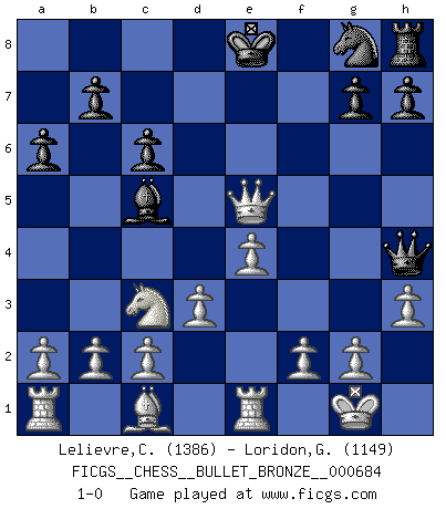 Last move : 1-0 2012 February 24 23:52:7 [Event "FICGS__CHESS__BULLET_BRONZE__000684"] [Site "FICGS"] [Date "2012.02.24"] [Round "1"] [White "Lelievre,Clement"] [Black "Loridon,Geoffroy"] [Result "1-0"] [WhiteElo "1386"] [BlackElo "1149"] 1.e4 e5 2.Nf3 Nc6 3.Bb5 a6 4.Bxc6 dxc6 5.Nc3 f6 6.O-O Bg4 7.h3 Bxf3 8.Qxf3 Bc5 9.d3 f5 10.Re1 Qh4 11.Qxf5 Rc8 12.Qxc8+ Ke7 13.Qxc7+ Ke8 14.Qxe5+ 1-0 Ruy Lopez : Exchange, Keres variation Kingside Castling by player White (move 6) Player White won this chess game. Follow this game move after move (download)Chess is in its essence a game, in its form an art, and in its execution a science. (Baron Tassilo) Jeder weiß, dass Gasprom Putins persönliches Machtinstrument ist. Die Firma wird vom Kreml aus geleitet und wird schon deshalb nie transparent sein. (Garry Kasparov) Mi estilo es algo parecido entre un poco de Tal y Petrosian. (Reshevsky) Le jeu d'échecs fait naître et fortifie en nous plusieurs qualités précieuses dans le cours de l'existence, telles que la prévoyance, la circonspection, la prudence, et la persévérance. (Benjamin Franklin - 1783, la morale des échecs) Thus, what is of supreme importance in war is to attack the enemy's strategy. (Sun Tzu)