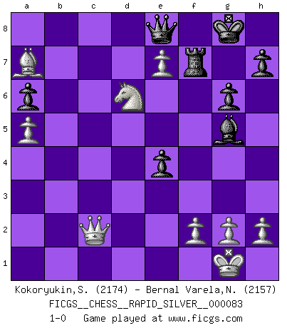 Last move : 1-0 2012 June 5 15:14:9 [Event "FICGS__CHESS__RAPID_SILVER__000083"] [Site "FICGS"] [Date "2012.02.25"] [Round "2"] [White "Kokoryukin,Sergey"] [Black "Bernal Varela,Nelson"] [Result "1-0"] [WhiteElo "2174"] [BlackElo "2157"] 1.d4 Nf6 2.c4 g6 3.Nc3 d5 4.cxd5 Nxd5 5.e4 Nxc3 6.bxc3 Bg7 7.Bc4 c5 8.Ne2 cxd4 9.cxd4 Nc6 10.Be3 O-O 11.O-O Na5 12.Bd3 Nc6 13.Bb5 Bd7 14.Rb1 a6 15.Bxc6 Bxc6 16.d5 Bb5 17.a4 Bc4 18.Rxb7 Rb8 19.Bb6 Qe8 20.Rxb8 Qxb8 21.a5 f5 22.Qc2 Bb5 23.Rc1 fxe4 24.Nd4 Bh6 25.d6 Bxc1 26.dxe7 Rf7 27.Nxb5 Bg5 28.Ba7 Qe8 29.Nd6 1-0 This chess game has been lost on time (started : 2012.02.25 13:55:23) King's Indian defense, 3.Nc3 Kingside Castling by player Black (move 10) Kingside Castling by player White (move 11) Player White won this chess game. Follow this game move after move (download)The passed Pawn is a criminal, who should be kept under lock and key. Mild measures, such as police surveillance, are not sufficient. (Aaron Nimzovich) Wie kann ich Remis annehmen? Ich weiß ja gar nicht, wie ich stehe! (Fritz Sämisch) No soy una persona materialista y por eso, no resiento la falta o pérdida del dinero. La ausencia de cosas mundanas carece de importancia. Ya que el Ajedrez es una forma en la que puedo ser tan materialista como yo desee sin tener la necesidad de vender mi alma. (Jamie Walter Adams) Le jeu d'échecs est comme rejeté hors du temps. (Antoine de Saint-Exupéry) Knowledge will give you power, but character respect. (Bruce Lee)