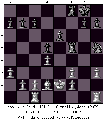 Last move : 0-1 2012 April 7 9:35:56 [Event "FICGS__CHESS__RAPID_A__000122"] [Site "FICGS"] [Date "2012.02.26"] [Round "1"] [White "Kastidis,Gerd"] [Black "Simmelink,Joop"] [Result "0-1"] [WhiteElo "1914"] [BlackElo "2079"] 1.e4 Nc6 2.d4 d5 3.e5 f6 4.exf6 Nxf6 5.Bb5 Qd6 6.Nf3 Bg4 7.Bxc6+ Qxc6 8.Nc3 Qe6+ 9.Be3 Qf5 10.Rc1 e6 11.h3 Bxf3 12.Qxf3 Qxf3 13.gxf3 Bb4 14.Bd2 Nh5 15.a3 Bxc3 16.Bxc3 O-O 17.Ke2 Rf5 18.Bd2 Raf8 0-1 KP : Nimzovich defense Kingside Castling by player Black (move 16) Player Black won this chess game. Follow this game move after move (download)Chess, like any creative activity, can exist only through the combined efforts of those who have creative talent, and those who have the ability to organize their creative work. (Mikhail Botvinnik) Wenn ein Kopf und ein Buch zusammenstoßen und es klingt hohl, ist es denn allemal im Buche? (Georg Christoph Lichtenberg) Al jugar al Ajedrez entonces, podemos aprender: Primero: Previsión... Segundo: Prudencia... Tercero: Cautela... Y al final, aprendemos del Ajedrez el hábito de no ser desanimados por apariencias malas presentes en el estado de nuestros asuntos, el hábito de la esperanza por una oportunidad favorable y la perseveración de los secretos de los recursos. (Benjamin Franklin) L'attaque fait le spectacle, la défense gagne les matchs. (Dicton footballistique) It's not enough to succeed. Others must fail. (Gore Vidal)