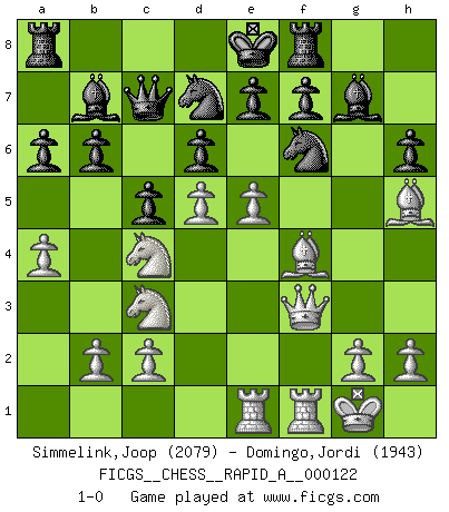 Last move : 1-0 2012 March 16 15:28:16 [Event "FICGS__CHESS__RAPID_A__000122"] [Site "FICGS"] [Date "2012.02.26"] [Round "1"] [White "Simmelink,Joop"] [Black "Domingo,Jordi"] [Result "1-0"] [WhiteElo "2079"] [BlackElo "1943"] 1.e4 h6 2.d4 c5 3.d5 d6 4.Nc3 g5 5.Be2 Nf6 6.f4 gxf4 7.Bxf4 Qb6 8.Nf3 Nbd7 9.Nd2 Rg8 10.Nc4 Qc7 11.O-O a6 12.a4 b6 13.Bh5 Bb7 14.Qf3 Bg7 15.Rae1 Rf8 16.e5 1-0 Carr's defense Kingside Castling by player White (move 11) Player White won this chess game. Follow this game move after move (download)Any material change in a position must come about by mate, a capture, or a Pawn promotion. (Purdy) Die Jungen erwarten, dass Opa einfach umfällt. Dann aber kann Opa fünf Stunden lang Schach spielen und die jungen Gegner an die Wand drücken. (Viktor Kortschnoi) Yo adoro todas la posiciones. Denme una partida posicional difícil, y la jugaré. Pero posiciones totalmente ganadas, no las tolero. (Hein Donner) Ce qui est bien, c'est d'avoir tout un tas de pièces en prise : l'adversaire ne peut en prendre qu'une à la fois. Cité par Thierry Audin. Establishing goals is all right if you don't let them deprive you of interesting detours. (Doug Larson)