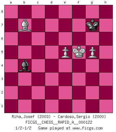Last move : 1/2-1/2 2012 August 3 0:51:42 [Event "FICGS__CHESS__RAPID_A__000122"] [Site "FICGS"] [Date "2012.02.26"] [Round "1"] [White "Riha,Josef"] [Black "Cardoso,Sergio"] [Result "1/2-1/2"] [WhiteElo "2003"] [BlackElo "2000"] 1.d4 d6 2.e4 g6 3.Nc3 Bg7 4.f4 Nf6 5.Nf3 O-O 6.Bd3 c5 7.dxc5 dxc5 8.O-O Nc6 9.e5 Nd5 10.Nxd5 Qxd5 11.c4 Qd8 12.Be3 Qc7 13.Be4 Rd8 14.Qc2 Bg4 15.Rad1 Bxf3 16.Bxf3 Nd4 17.Bxd4 cxd4 18.Rd3 Rac8 19.Rc1 e6 20.Qd2 Bf8 21.c5 Qe7 22.b4 b6 23.cxb6 Rxc1+ 24.Qxc1 axb6 25.a3 Bh6 26.Qd2 Qc7 27.h4 f5 28.Bd1 b5 29.Kh2 Qc4 30.g3 Qd5 31.Qg2 Qc4 32.Qf3 Qc7 33.Be2 Qb6 34.Rd2 Rc8 35.Qd3 Rc4 36.a4 Rxb4 37.axb5 Bf8 38.Qf3 Qc5 39.Qc6 Qd5 40.Rc2 Qb3 41.Bf1 Ra4 42.Kh3 Ra3 43.Rg2 Kg7 44.Qd7+ Kh6 45.Qd8 Bc5 46.Qg5+ Kg7 47.Qf6+ Kg8 48.Qd8+ Bf8 49.Qxd4 Ra4 50.Qd3 Qxd3 51.Bxd3 Rd4 52.Bb1 Rb4 53.Ba2 Kf7 54.Rc2 Rxb5 55.Rc6 Rc5 56.Rxe6 Kg7 57.h5 Rc7 58.hxg6 hxg6 59.g4 Rc3+ 60.Kh4 Rf3 61.Kg5 Kh7 62.Rxg6 Be7+ 63.Kxf5 Rxf4+ 64.Kxf4 Kxg6 65.Bb1+ Kh6 66.Be4 Kg7 67.Kf5 Bc5 68.g5 Bb4 69.Bb7 1/2-1/2 Queen's Pawn Kingside Castling by player Black (move 5) Kingside Castling by player White (move 8) 10 pieces endgame at move 62 : White KRBPPP , Black KRBP WHITE : King + 1 Rook 1 Bishop 3 Pawns BLACK : King + 1 Rook 1 Bishop 1 Pawn 9 pieces endgame at move 63 : White KRBPPP , Black KRB WHITE : King + 1 Rook 1 Bishop 3 Pawns BLACK : King + 1 Rook 1 Bishop 8 pieces endgame at move 63 : White KRBPP , Black KRB WHITE : King + 1 Rook 1 Bishop 2 Pawns BLACK : King + 1 Rook 1 Bishop 7 pieces endgame at move 64 : White KRBPP , Black KB WHITE : King + 1 Rook 1 Bishop 2 Pawns BLACK : King + 1 Bishop 6 pieces endgame at move 64 : White KBPP , Black KB WHITE : King + 1 Bishop 2 Pawns BLACK : King + 1 Bishop This chess game ended in a draw. Follow this game move after move (download)All I want to do, ever, is just play Chess. (Bobby Fischer) Je mehr ich von der FIDE weiss, um so weniger verstehe ich. (Alexander Kalifman) Juega la Apertura como un libro, el Juego Medio como un mago y los Finales como una máquina. (Spielmann) Toute estimation doit être constamment réévaluée. (Jacob Estrin) If we don't succeed, we run the risk of failure. (George W. Bush)
