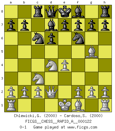 Last move : 0-1 2012 April 12 11:35:32 [Event "FICGS__CHESS__RAPID_A__000122"] [Site "FICGS"] [Date "2012.02.26"] [Round "1"] [White "Chlewicki,Grzegorz"] [Black "Cardoso,Sergio"] [Result "0-1"] [WhiteElo "2000"] [BlackElo "2000"] 1.e4 c5 2.Nf3 d6 3.d4 cxd4 4.Nxd4 Nf6 5.Nc3 Nc6 6.Bg5 Bd7 7.Qd2 Rc8 0-1 This chess game has been lost on time (started : 2012.02.26 0:47:39) Sicilian : Richter-Rauzer, Larsen variation, 7.Qd2 Player Black won this chess game. Follow this game move after move (download)It is always better to sacrifice your opponent's men. (Savielly Tartakower) Ich bin der einzige Schachspieler, der sich während der Vorbereitungen zum Turnier verletzt hat. (Woody Allen) El Ajedrez es el juego mas altamente simbólico, pero las agresiones estan por lo tanto aún mas francamente representadas en la partida. Tal vez comenzo como un juego de guerra; Algo como la representación de una batalla en miniatura entre las fuerzas de dos reinos. (Karl Meninger) Votre prénom est 'Tactique', votre deuxième prénom est 'Tactique' et votre nom est 'Tactique'. (Ken Smith) God, you are such an idiot. - Actually, I thought I was more of a jerk. (Gregory House to Stacy Warner, House M.D.)