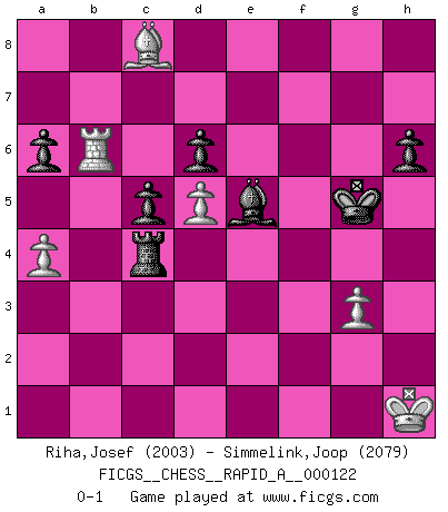 Last move : 0-1 2012 March 7 14:2:50 [Event "FICGS__CHESS__RAPID_A__000122"] [Site "FICGS"] [Date "2012.02.26"] [Round "1"] [White "Riha,Josef"] [Black "Simmelink,Joop"] [Result "0-1"] [WhiteElo "2003"] [BlackElo "2079"] 1.c4 Nc6 2.Nf3 e5 3.Nc3 f5 4.d4 e4 5.Ng5 h6 6.Nh3 g5 7.e3 Nf6 8.f3 exf3 9.Qxf3 d6 10.Qd1 Ne7 11.Be2 Bg7 12.O-O O-O 13.Nf2 c5 14.d5 Bd7 15.Qb3 Rb8 16.Bd2 Ng6 17.Nh1 f4 18.Nf2 fxe3 19.Bxe3 a6 20.Bd2 Bf5 21.Rae1 Qd7 22.Qb6 Rbe8 23.h3 Ne5 24.Qb3 g4 25.hxg4 Nfxg4 26.Nce4 Nxf2 27.Nxf2 Ng6 28.a4 Bd4 29.Qg3 Be5 30.Qb3 Qg7 31.Ng4 Bxg4 32.Bxg4 Bd4+ 33.Kh2 Rxe1 34.Rxe1 Qf6 35.Be6+ Kh8 36.Qh3 Nf4 37.Qg3 Bxb2 38.Kh1 Be5 39.Bxf4 Qxf4 40.Qxf4 Rxf4 41.Rc1 Rf2 42.Kg1 Bd4 43.Kh1 Kg7 44.g3 Kf6 45.Bc8 Kg5 46.Rb1 Rc2 47.Rxb7 Rxc4 48.Rb6 Be5 0-1 Joop Simmelink thanks for the game! English Opening Kingside Castling by player White (move 12) Kingside Castling by player Black (move 12) Player Black won this chess game. Follow this game move after move (download)A passed Pawn increases in strength as the number of pieces on the board diminishes. (Capablanca) Kasparov ist eine Art Monster mit hundert Augen, denen auch nicht das Geringste entgeht. (Tony Miles) Un buen jugador siempre tiene buena suerte. (José Raúl Capablanca) Aucun coup ne doit être joué sans but. (Pedro Damiano) It's not the will to win, but the will to prepare to win that makes the difference. (Bear Bryant)