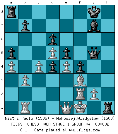 Last move : 0-1 2007 April 13 14:19:42 [Event "FICGS__CHESS__WCH_STAGE_1_GROUP_04__000002"] [Site "FICGS"] [Date "2007.01.16"] [Round "1"] [White "Nistri,Paolo"] [Black "Makosiej,Wladyslaw"] [Result "0-1"] [WhiteElo "1306"] [BlackElo "1600"] 1.d4 Nf6 2.c4 g6 3.Nc3 Bg7 4.Nf3 O-O 5.e3 d6 6.Bd3 Nbd7 7.O-O e5 8.d5 Nc5 9.e4 a5 10.a4 Bg4 11.h3 Bxf3 12.Qxf3 Nb3 13.Rb1 Nd4 14.Qd1 Nh5 15.Ne2 c6 16.Be3 c5 17.b3 f5 18.Nxd4 cxd4 19.Bd2 f4 20.Qc1 Qh4 21.f3 Ng3 22.Rd1 g5 23.Be1 h5 24.Bxg3 Qxg3 25.Rd2 g4 26.hxg4 hxg4 27.Be2 gxf3 28.Bxf3 Rf6 29.Qe1 Qg5 30.Rf2 Rh6 31.Kf1 Rh1+ 0-1 King's Indian defense, 3.Nc3 Kingside Castling by player Black (move 4) Kingside Castling by player White (move 7) Player Black won this chess game. Follow this game move after move (download)When I asked Fischer why he had not played a certain move in our game, he replied: 'Well, you laughed when I wrote it down !' (Mikhail Tal) Das Spiel gibt uns die Genugtuung, die das Leben uns versagt. (Emanuel Lasker) Te sientas frente a un tablero y repentinamente tu corazón brinca. Tu mano tiembla al tomar una pieza y moverla. Pero lo que el Ajedrez te enseña es que tu debes permanecer ahí con calma y pensar de que si realmente es una buena idea o de que si hay otras ideas mejores. (Stanley Kubrick) Aucun coup ne doit être joué sans but. (Pedro Damiano) It's not the will to win, but the will to prepare to win that makes the difference. (Bear Bryant)
