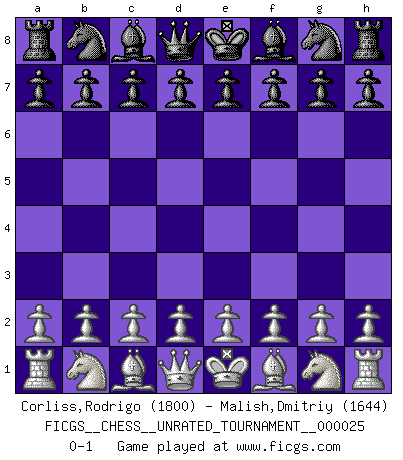 Last move : 0-1 2012 April 6 23:24:30 [Event "FICGS__CHESS__UNRATED_TOURNAMENT__000025"] [Site "FICGS"] [Date "2012.02.26"] [Round "1"] [White "Corliss,Rodrigo"] [Black "Malish,Dmitriy"] [Result "0-1"] [WhiteElo "1800"] [BlackElo "1644"] 0-1 This chess game has been lost on time (started : 2012.02.26 13:9:50) Player Black won this chess game. Follow this game move after move (download)Good positions don't win games, good moves do. (Gerald Abrahams) Modernes Schach erfordert enorme Anspannung. Es ist für einen normalen Menschen unmöglich das auszuhalten. (Viktor Kortschnoi) Tu sabes, camarada Pachman, no disfruto el ser un Ministro, preferería jugar al Ajedrez como tu. (Che Guevara) À la honte des hommes, on sait que les lois du jeu sont les seules qui soient partout justes, claires, inviolables et exécutées. Pourquoi l'Indien qui a donné les règles du jeu d'échecs est-il obéi de bon gré dans toute la terre, et que les décrétales des papes, par exemple, sont aujourd'hui un objet d'horreur et de mépris ? C'est que l'inventeur des échecs combina tout avec justesse pour la satisfaction des joueurs, et que les papes, dans leurs décrétales, n'eurent en vue que leur seul avantage. L'Indien voulut exercer également l'esprit des hommes et leur donner du plaisir; les papes ont voulu abrutir l'esprit des hommes. Voltaire (Dictionnaire philosophique / Garnier 1967) Warrior pose battles inner weakness and wins focus. You see that there is no war within you. You're on your own side, and you are your own strength. (Terri Guillemets)