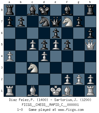 Last move : 1-0 2006 July 28 3:3:19 [Event "FICGS__CHESS__RAPID_C__000001"] [Site "FICGS"] [Date "2006.05.12"] [Round "1"] [White "Diaz Felez,Paco"] [Black "Sartorius,Julien"] [Result "1-0"] [WhiteElo "1400"] [BlackElo "1200"] 1.e4 Nf6 2.e5 Nd5 3.d4 f5 4.Nf3 e6 5.c4 Nb6 6.a4 d5 7.c5 Nc4 8.b3 c6 9.bxc4 Nd7 10.cxd5 cxd5 11.Ng5 Qe7 12.Nc3 h6 13.Qh5+ Kd8 14.Nf7+ 1-0 This chess game has been lost on time (started : 2006.05.12 15:29:17) Alekhine's defense Player White won this chess game. Follow this game move after move (download)My God, Bobby Fischer plays so simply. (Alexei Suetin) Auf jeden Fall musst du zuerst Rechtsanwalt werden, damit du deine eigenen Interessen und die deiner Familie vertreten kannst. [Brief an seinen Sohn] (José Raúl Capablanca) Yo no le temo a Spassky. Todos saben que yo soy el mejor. Uno no necesita un torneo para probarlo. (Bobby Fischer) Le profane ne songe pas à la somme de jouissance dont il se prive, qui méconnaît ce jeu aux ressources aussi variées que passionnantes. (Jean-Marie Jeanton-Lamarche) Control your own destiny or someone else will. (Jack Welch)