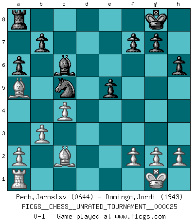 Last move : 0-1 2012 November 3 10:10:20 [Event "FICGS__CHESS__UNRATED_TOURNAMENT__000025"] [Site "FICGS"] [Date "2012.02.26"] [Round "1"] [White "Pech,Jaroslav"] [Black "Domingo,Jordi"] [Result "0-1"] [WhiteElo "0644"] [BlackElo "1943"] 1.e4 h6 2.d4 c5 3.Nf3 cxd4 4.Qxd4 Nc6 5.Qa4 Nf6 6.e5 Nd5 7.Na3 e6 8.Nb5 d6 9.Nxd6+ Bxd6 10.exd6 Qxd6 11.Bb5 Bd7 12.O-O O-O 13.Rd1 a6 14.Bf1 Rfd8 15.Qg4 Ne5 16.Nxe5 Qxe5 17.c4 Nf6 18.Qe2 Qxe2 19.Bxe2 Ba4 20.b3 Rxd1+ 21.Bxd1 Bc6 22.Bd2 Ne4 23.Ba5 e5 24.Bc2 Nc5 0-1 This chess game has been lost on time (started : 2012.02.26 13:9:50) Carr's defense Kingside Castling by player White (move 12) Kingside Castling by player Black (move 12) Player Black won this chess game. Follow this game move after move (download)Fischer, who may or may not be mad as a hatter, has every right to be horrified. (Jeremy Silman) Das Spiel gibt uns die Genugtuung, die das Leben uns versagt. (Emanuel Lasker) El Ajedrez es un terrible juego. Si no controlas el centro, tu oponente tiene una posición mas holgada. Si tienes control del centro, ¡entonces realmente tu tienes algo de que preocuparte!. (Siegbert Tarrasch) L'action d'une oeuvre littéraire se déroule sur un champ de bataille. Les masques et les types du drame moderne correspondent aux pièces du jeu d'échecs. L'intrigue correspond aux coups et aux gambits, c'est à dire aux techniques du jeu telles qu'utilisées et interprétées par les joueurs. Les tactiques et les péripéties [mouvements] correspondent aux coups exécutés par l'adversaire. (Viktor Shklovsky) The beginning of wisdom is silence. The second step is listening. (Unknown)