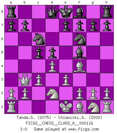 Last move : 1-0 2012 April 13 23:42:47 [Event "FICGS__CHESS__CLASS_A__000116"] [Site "FICGS"] [Date "2012.02.28"] [Round "1"] [White "Tanda,Giovanni"] [Black "Chlewicki,Grzegorz"] [Result "1-0"] [WhiteElo "2075"] [BlackElo "2000"] 1.d4 d5 2.Bf4 Nf6 3.e3 c5 4.c3 Nc6 5.Nd2 Bf5 6.Qb3 1-0 This chess game has been lost on time (started : 2012.02.28 19:49:37) Queen's pawn, Mason variation Player White won this chess game. Follow this game move after move (download)Chess is thirty to forty percent psychology. You don't have this when you play a computer. I can't confuse it. (Judith Polgar) Mein Name ist Rustam Kamsky. Sie haben meinen Sohn belästigt. Bereiten Sie sich aufs Sterben vor. (Rustam Kamsky) Yo siempre he tenido un ligero sentimiento de lástima por una persona que no tiene conocimiento del Ajedrez. (Siegbert Tarrasch) En blitz, le Cavalier l'emporte sur le Fou. (Vlastimil Hort) For peace of mind, resign as general manager of the universe. (Douglas Adams)