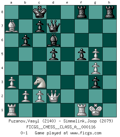 Last move : 0-1 2012 September 20 19:45:35 [Event "FICGS__CHESS__CLASS_A__000116"] [Site "FICGS"] [Date "2012.02.28"] [Round "1"] [White "Puzanov,Vasyl"] [Black "Simmelink,Joop"] [Result "0-1"] [WhiteElo "2140"] [BlackElo "2079"] 1.e4 Nc6 2.d4 d5 3.e5 f6 4.f4 Nh6 5.Nf3 Bf5 6.Nc3 e6 7.Be2 Qd7 8.a3 O-O-O 9.O-O Be4 10.Be3 Nf5 11.Bf2 h5 12.Qd2 Bxf3 13.Bxf3 fxe5 14.dxe5 g5 15.fxg5 Nxe5 16.Be2 Ng4 17.Bxa7 Bd6 18.g3 Rdf8 19.Bd3 h4 20.Bxf5 exf5 21.h3 hxg3 22.hxg4 b6 0-1 This chess game has been lost on time (started : 2012.02.28 19:49:37) KP : Nimzovich defense Queenside Castling by player Black (move 8) Kingside Castling by player White (move 9) Player Black won this chess game. Follow this game move after move (download)Only sissies Castle. (Rob Sillars) Wenn Du absolut nicht mehr weißt, was Du tun sollst, dann ist es Zeit für Panik. (John van der Wiel) El Ajedrez no es como la vida... ¡tiene reglas!. (Mark Pasternak) Si le désir cupide (et stupide) de gagner est une inépuisable source de souffrance, une combinaison brillante sur l'échiquier est une découverte : le coquelicot qui s'épanouit lorsque apparaît la Voie Lactée. (Arrabal) I've lost money so fast in these clubs it's left me reeling. I've read every poker book ever written, but the only way to get better at the game is to go out and play with people who are really good. The problem is, you stand to lose a lot of money doing it. (Matt Damon)