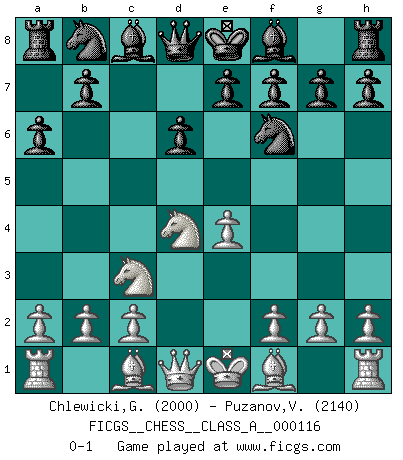 Last move : 0-1 2012 May 17 13:25:48 [Event "FICGS__CHESS__CLASS_A__000116"] [Site "FICGS"] [Date "2012.02.28"] [Round "1"] [White "Chlewicki,Grzegorz"] [Black "Puzanov,Vasyl"] [Result "0-1"] [WhiteElo "2000"] [BlackElo "2140"] 1.e4 c5 2.Nf3 d6 3.d4 cxd4 4.Nxd4 Nf6 5.Nc3 a6 0-1 This chess game has been lost on time (started : 2012.02.28 19:49:37) Sicilian : Najdorf Player Black won this chess game. Follow this game move after move (download)Later, I began to succeed in decisive games. Perhaps because I realized a very simple truth: not only was I worried, but also my opponent. (Mikhail Tal) Wenn Schach ein enormer Dschungel ist, der seine Myriaden von Geheimnissen nicht preisgeben will, dann sind Computer die Kettensägen einer gewaltigen ökologisch unsensiblen Nutzholzfirma. (Nigel Short) Coloca el contenido de las piezas del Ajedrez en un sombrero, agitalo vigorosamente, arrojalas en un tablero desde una altura de 30 centimetros y así obtendras el estilo de Steinitz. (H. E. Bird) La victoire dans une partie d'Echecs appartient la plupart du temps à celui qui voit un peu plus loin que l'adversaire. (Lasker) No, no, you're not thinking; you're just being logical. (Niels Bohr)