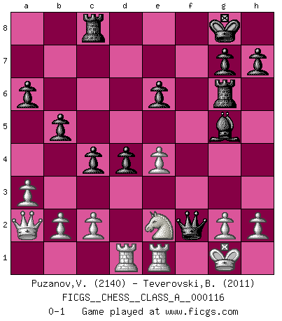 Last move : 0-1 2012 September 10 22:34:21 [Event "FICGS__CHESS__CLASS_A__000116"] [Site "FICGS"] [Date "2012.02.28"] [Round "1"] [White "Puzanov,Vasyl"] [Black "Teverovski,Bogoljub"] [Result "0-1"] [WhiteElo "2140"] [BlackElo "2011"] 1.e4 c5 2.Nf3 Nc6 3.d4 cxd4 4.Nxd4 e5 5.Nb5 d6 6.Bc4 Be6 7.Bxe6 fxe6 8.O-O a6 9.N5c3 Nf6 10.Bg5 Be7 11.Qd3 Nd7 12.Be3 Rc8 13.a3 O-O 14.Nd2 Nc5 15.Qc4 b5 16.Qa2 Rf6 17.Rfe1 Rg6 18.Rad1 Bg5 19.Bxc5 dxc5 20.Nf3 Qf6 21.Ne2 Nd4 22.Nfxd4 exd4 23.Qb3 c4 24.Qa2 Qxf2+ 0-1 Sicilian : Labourdonnais-Loewenthal (Kalashnikov) variation Kingside Castling by player White (move 8) Kingside Castling by player Black (move 13) Player Black won this chess game. Follow this game move after move (download)I like the moment when I break a man's ego. (Bobby Fischer) Ich würde mich als ganz normalen Jungen bezeichnen [Im Alter von 12]. (Sergej Karjakin) Para mi, el Ajedrez es la vida y cada partida es como una nueva vida. Todo jugador de Ajedrez suele vivir muchas vidas durante su vida. (Eduard Gufeld) La vie est comme un jeu d'échecs : nous esquissons un plan, mais celui-ci est tributaire de ce que daignent faire l'adversaire aux échecs et le destin dans la vie. (Arthur Schopenhauer) Life doesn't imitate art, it imitates bad television. (Woody Allen)