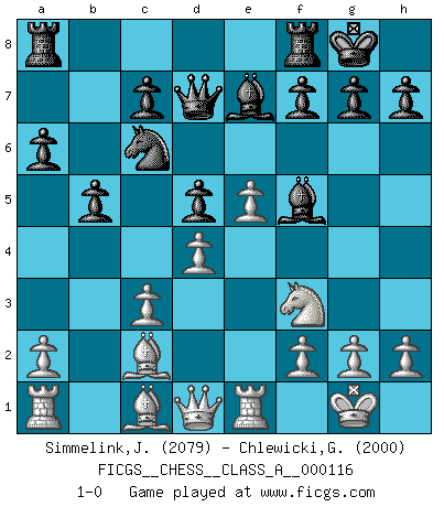 Last move : 1-0 2012 May 11 0:58:13 [Event "FICGS__CHESS__CLASS_A__000116"] [Site "FICGS"] [Date "2012.02.28"] [Round "1"] [White "Simmelink,Joop"] [Black "Chlewicki,Grzegorz"] [Result "1-0"] [WhiteElo "2079"] [BlackElo "2000"] 1.e4 e5 2.Nf3 Nc6 3.Bb5 a6 4.Ba4 Nf6 5.O-O Be7 6.Re1 b5 7.Bb3 O-O 8.c3 d5 9.d4 exd4 10.e5 Ne4 11.cxd4 Bf5 12.Nc3 Nxc3 13.bxc3 Qd7 14.Bc2 1-0 Ruy Lopez : Closed, 7...O-O Kingside Castling by player White (move 5) Kingside Castling by player Black (move 7) Player White won this chess game. Follow this game move after move (download)Chess holds its master in its own bonds, shackling the mind and brain so that the inner freedom of the very strongest must suffer. (Albert Einstein) Die unerbitterlichsten Regeln im Schach sind die Ausnahmen. (Savielly Grigorievitsch Tartakower) Preferería tener un Peón que un dedo. (Reuben Fine) Vous n'êtes pas toujours obligé de jouer le meilleur coup. Un coup doit être actif, entreprenant, correct et beau ! (David Bronstein) Now the reason the enlightened prince and the wise general conquer the enemy whenever they move and their achievements surpass those of ordinary men is foreknowledge. (Sun Tzu)