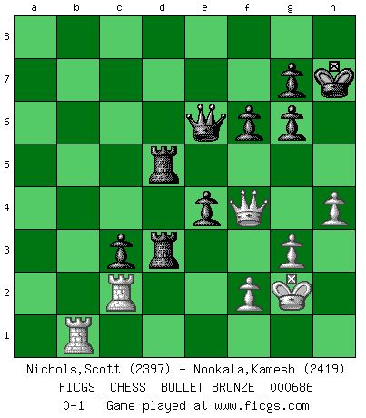 Last move : 0-1 2012 March 1 17:12:20 [Event "FICGS__CHESS__BULLET_BRONZE__000686"] [Site "FICGS"] [Date "2012.03.01"] [Round "1"] [White "Nichols,Scott"] [Black "Nookala,Kamesh"] [Result "0-1"] [WhiteElo "2397"] [BlackElo "2419"] 1.Nf3 Nf6 2.g3 d5 3.Bg2 c6 4.O-O Bf5 5.d3 e6 6.Nbd2 Be7 7.Nh4 Bg6 8.Nxg6 hxg6 9.c3 Nbd7 10.Nf3 Qc7 11.Qc2 O-O 12.Bf4 e5 13.Bd2 a5 14.Rad1 Rfe8 15.Ng5 Qb6 16.Bh3 Bc5 17.Rb1 Nf8 18.Bg2 Ne6 19.Nxe6 Rxe6 20.a4 Qa6 21.h4 R6e8 22.Bg5 Nh7 23.Bc1 Nf8 24.Bd2 Ne6 25.Rfe1 Bd6 26.Bh3 Qb6 27.e4 Bc5 28.Rf1 Qd8 29.Rbd1 Rb8 30.exd5 Qxd5 31.Rfe1 Rbd8 32.Bc1 Ba7 33.Bg2 Qd6 34.Re2 Qb8 35.Bf1 Kf8 36.R2e1 Kg8 37.b4 axb4 38.Bh3 e4 39.d4 bxc3 40.Bxe6 Rxe6 41.Bf4 Qc8 42.Qxc3 Rd5 43.Be3 Qd7 44.Rb1 Bxd4 45.Bxd4 Rxd4 46.Rxb7 Qd6 47.Rb2 c5 48.Kg2 Rxa4 49.R1e2 Kh7 50.Rbc2 Re5 51.Qb3 Qc6 52.Qe3 Rd5 53.Re1 Rad4 54.Kg1 c4 55.Kh2 Qe6 56.Kg2 f6 57.Rb1 Rd3 58.Qf4 c3 0-1 Reti Opening Kingside Castling by player White (move 4) Kingside Castling by player Black (move 11) Player Black won this chess game. Follow this game move after move (download)Chess is above all, a fight ! (Emanuel Lasker) Ein bischen Romantik kann weder im Schach noch in der Liebe schaden. Also versuche ich mich ab und zu daran zu erinnern. (Nigel Short) El Ajedrez era la lengua materna de Capablanca. (Reti) Donnez-moi un Cavalier en 6e et je gagnerais toutes mes parties. (Steinitz) Always be a first-rate version of yourself, instead of a second-rate version of somebody else. (Judy Garland)