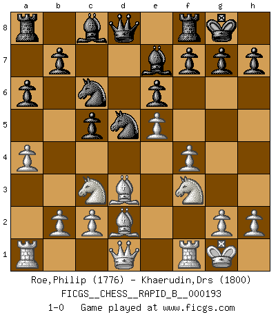 Last move : 1-0 2012 April 23 12:7:5 [Event "FICGS__CHESS__RAPID_B__000193"] [Site "FICGS"] [Date "2012.03.01"] [Round "1"] [White "Roe,Philip"] [Black "Khaerudin,Drs"] [Result "1-0"] [WhiteElo "1776"] [BlackElo "1800"] 1.Nc3 Nf6 2.e4 d6 3.d4 e6 4.f4 Be7 5.Nf3 O-O 6.Bd3 c5 7.dxc5 dxc5 8.O-O Nc6 9.e5 Nd5 10.Bd2 a6 11.a4 1-0 This chess game has been lost on time (started : 2012.03.01 21:23:18) Dunst (Sleipner, Heinrichsen) Opening Kingside Castling by player Black (move 5) Kingside Castling by player White (move 8) Player White won this chess game. Follow this game move after move (download)The older I grow, the more I value Pawns. (Keres) Ich verstehe mehr vom Schach als irgendein anderer lebender Meister. (José Raúl Capablanca) El Ajedrez demanda una total concentración. (Bobby Fischer) Les pièces de l'échiquier étaient impitoyables. Elles le retenaient, elles l'absorbaient. Il y avait de l'horreur en cela, mais aussi une harmonie unique. Car, qu'y a-t-il dans le monde, à part les échecs ? (V. Nabokov) The quality of decision is like the well-timed swoop of a falcon which enables it to strike and destroy its victim. (Sun Tzu)