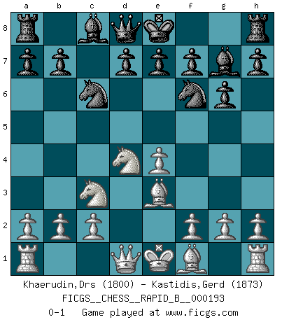 Last move : 0-1 2012 April 19 11:45:58 [Event "FICGS__CHESS__RAPID_B__000193"] [Site "FICGS"] [Date "2012.03.01"] [Round "1"] [White "Khaerudin,Drs"] [Black "Kastidis,Gerd"] [Result "0-1"] [WhiteElo "1800"] [BlackElo "1873"] 1.e4 c5 2.Nf3 g6 3.Nc3 Nc6 4.d4 cxd4 5.Nxd4 Bg7 6.Be3 Nf6 0-1 This chess game has been lost on time (started : 2012.03.01 21:23:18) Sicilian : Hungarian variation Player Black won this chess game. Follow this game move after move (download)Chess is a fairy tale of 1001 blunders. (Savielly Tartakower) Im Reiche der Wirklichkeit ist man nie so glücklich wie im Reiche der Gedanken. (Arthur Schopenhauer) Por tratar de evitar la pérdida de una pieza, muchas personas han perdido una partida de Ajedrez. (Savielly Tartakover) On peut tirer plus d'utilité d'une partie perdue que de 100 parties gagnées. (Capablanca) There are two major products that came out of Berkeley: LSD and UNIX. We do not believe this is to be a coincidence. (Jeremy S. Anderson)