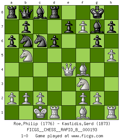 Last move : 1-0 2012 April 19 18:44:16 [Event "FICGS__CHESS__RAPID_B__000193"] [Site "FICGS"] [Date "2012.03.01"] [Round "1"] [White "Roe,Philip"] [Black "Kastidis,Gerd"] [Result "1-0"] [WhiteElo "1776"] [BlackElo "1873"] 1.e4 c5 2.Nf3 g6 3.d4 cxd4 4.Qxd4 Nf6 5.e5 Nc6 6.Qa4 Nd5 7.Qe4 Nb6 8.Bf4 Bg7 9.Nc3 O-O 10.O-O-O Qc7 11.h4 Rd8 12.Nb5 Qb8 13.h5 a6 14.e6 d6 15.exf7+ 1-0 Sicilian : Hungarian variation Kingside Castling by player Black (move 9) Queenside Castling by player White (move 10) Player White won this chess game. Follow this game move after move (download)Chess is thirty to forty percent psychology. You don't have this when you play a computer. I can't confuse it. (Judith Polgar) Der Verteidiger gebe der Gewalt nach, aber nur der Gewalt. Er schaffe sich nicht freiwillig, etwa aus Blindheit oder aus Schrecken, irgendwelche Schwächen. Er lasse sich nicht bluffen. (Emanuel Lasker) El juego del Ajedrez no es solamente una diversión quieta; algunas cualidades muy valuables de la mente se pueden adquirir y cultivar con el, como convertirlos en habitos disponibles para toda ocasión; ya que la vida es algo así como el Ajedrez. (Benjamin Franklin) Le pion, dans sa simplicité, marche droit devant lui, mais lorsqu'il prend, il le fait obliquement? Ainsi l'homme, tant qu'il reste pauvre, marche dans la droiture et vit honnêtement, mais lorsqu'il recherche les honneurs, il flatte, se parjure et, par les voies obliques, cherche une position supérieure sur l'échiquier du monde. (Jean de Galles) Art is the only way to run away without leaving home. (Twyla Tharp)