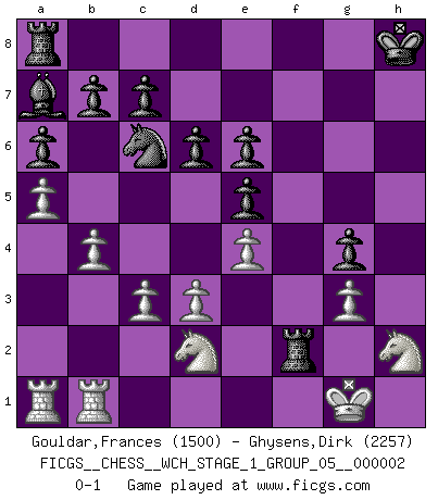 Last move : 0-1 2007 February 10 13:48:59 [Event "FICGS__CHESS__WCH_STAGE_1_GROUP_05__000002"] [Site "FICGS"] [Date "2007.01.16"] [Round "1"] [White "Gouldar,Frances"] [Black "Ghysens,Dirk"] [Result "0-1"] [WhiteElo "1500"] [BlackElo "2257"] 1.e4 e5 2.Nf3 Nc6 3.Bc4 Nf6 4.d3 Bc5 5.O-O d6 6.c3 Bb6 7.Bg5 h6 8.Bh4 O-O 9.Nbd2 a6 10.Re1 Bd7 11.b4 Qe7 12.a4 Ba7 13.a5 Kh8 14.Nf1 Be6 15.Qb3 Bxc4 16.Qxc4 g5 17.Bg3 Qe6 18.Qxe6 fxe6 19.h3 Nh5 20.Bh2 Nf4 21.Bxf4 Rxf4 22.N1d2 h5 23.Reb1 g4 24.hxg4 hxg4 25.g3 R4f8 26.Nh2 Rxf2 0-1 Two knights defense (Modern Bishop's Opening) Kingside Castling by player White (move 5) Kingside Castling by player Black (move 8) Player Black won this chess game. Follow this game move after move (download)You need not play well - just help your opponent to play badly. (Genrikh Chepukaitis) Smyslow ist ein Beweis dafür, dass ich noch zehn Jahre spielen kann! [der 75 jährige über den 85 jährigen] (Viktor Kortschnoi) El Ajedrez es de 30 a 40 por ciento psicología. Uno no cuenta con esto cuando se juega contra una computadora. No lo puedo confundir. (Judith Polgar) Les Echecs représentent une sphère d'idées créatrices basée sur la volonté des deux protagonistes. (Smyslov) Two beer, or not two beer. (Unknown)